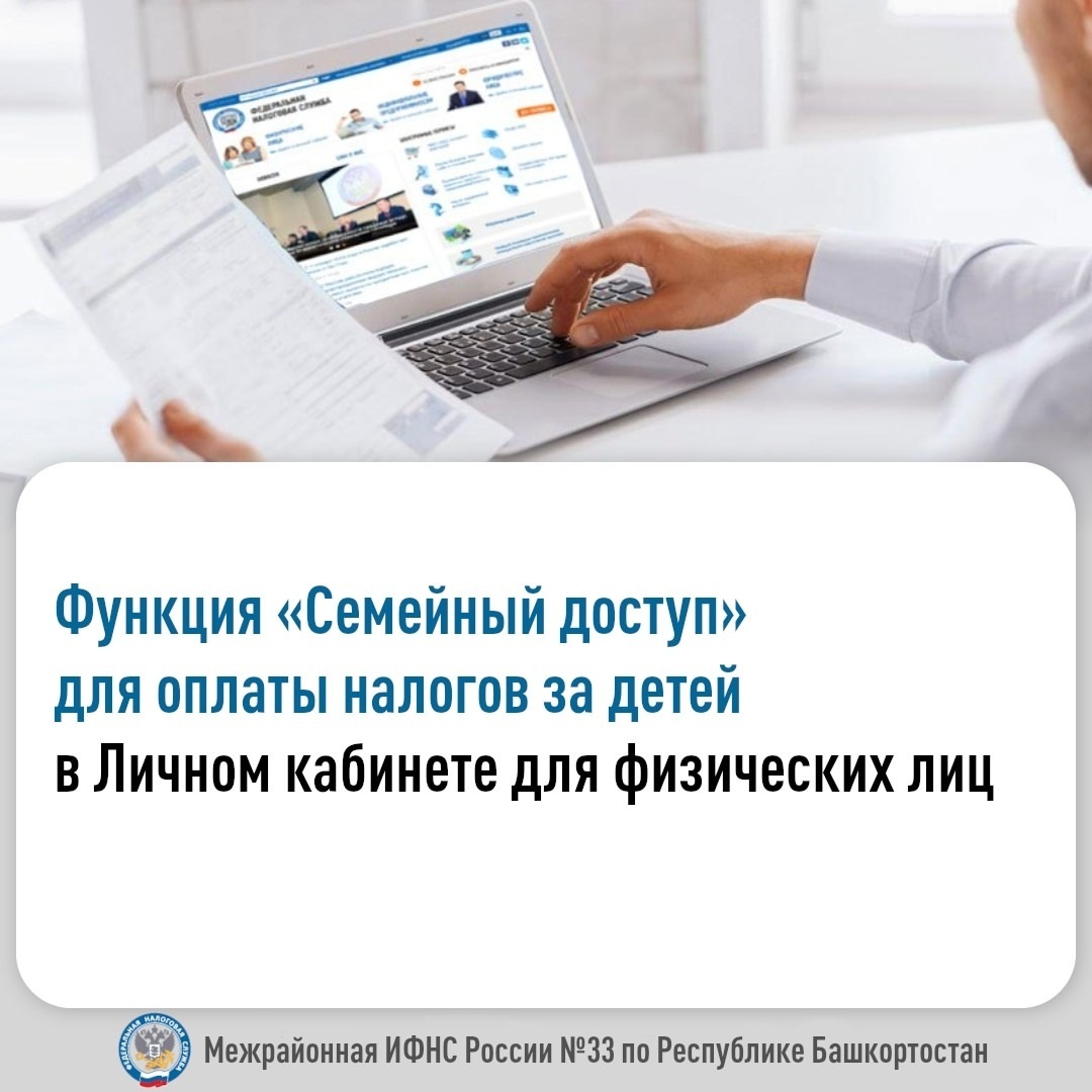 Функция «Семейный доступ» для оплаты налогов за несовершеннолетних детей доступна в Личном кабинете налогоплательщика. Такой функционал доступен зарегистрированным пользователям сервиса. Для того чтобы связать Личный кабинет ребенка с Личным кабинетом родителя, необходимо перейти в раздел «Профиль» - «Настройки» и после этого выполнить следующие действия: - во вкладке «Семейный доступ» нажать кнопку «Добавить пользователя»; ввести ИНН несовершеннолетнего ребенка и нажать кнопку «Отправить запрос»; - зайти в Личный кабинет ребенка и подтвердить запрос. После этого в родительском Личном кабинете в разделе «Налоги» появится список добавленных несовершеннолетних детей. Произвести оплату налогов через Личный кабинет можно любым удобным способом: банковской картой, через онлайн-банк или распечатать квитанцию. Напомним, ребенок признается налогоплательщиком, если у него есть доля в квартире, доме или на него оформлен объект недвижимости. Имущественный налог за него уплачивает родитель или опе