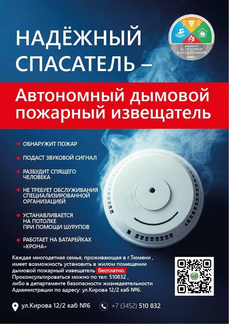 Каждая многодетная семья, проживающая в Тюмени , имеет возможность установить в жилом помещении дымовой пожарный извещатель бесплатно. Беспроводной прибор реагирует на задымление, подаст мощный звуковой сигнал, разбудит спящего человека, нужен в каждом доме для семьи с детьми. Проконсультироваться можно по телефону 510832 , либо в департаменте безопасности жизнедеятельности администрации по адресу: ул. Кирова, 12/2, каб №6. По информации департамента управы Ленинского административного округа