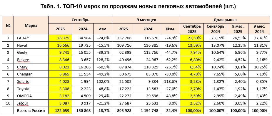 У статистиков сегодня есть два стакана - наполовину полный и наполовину пустой. "По данным агентства "Автостат", в сентябре 2025-го в нашей стране было продано 122,7 тыс. новых легковых автомобилей. И это наилучший показатель в нынешнем году! Причем авторынок ставит рекорды третий месяц подряд и превышает отметку в 120 тыс. единиц", - сообщают коллеги из аналитического агентства. Но тут же сами оговариваются: "Но если сравнивать результат сентября с уровнем годичной давности, то он оказывается на 18,7% меньше…" Поэтому одни спокойно могут в комментариях под постом писать о буме на рынке, вторые - о его обрушении. И все будут правы. Бывает и так. Мы же приведем несколько самых интересных, на наш взгляд, фактов из сентябрьских табличек. ✅ Chery начала падение - вот уж у кого продажи рухнули. Но понятно, почему: где-то во второй десятке незримо рвется в топы марка Tenet. Сможет ли она достичь уровня "Чери" - вопрос. Но поменяются ли они местами в рейтингах, - если и вопрос, то лишь в