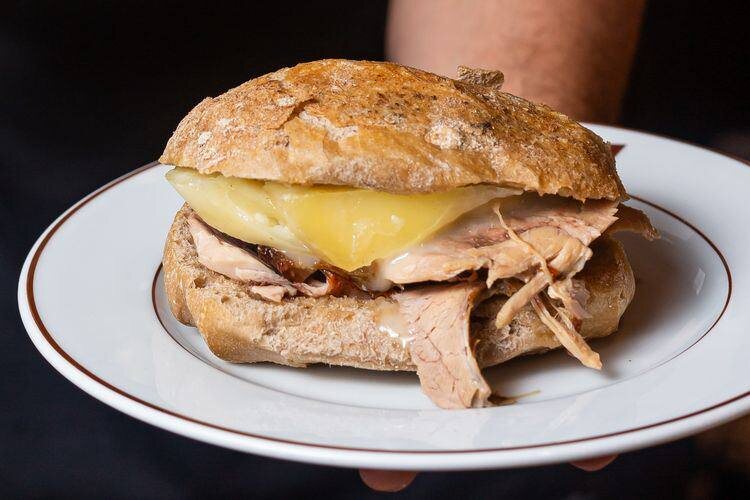 Sandes de Pernil/Сандеш де Пернил Бутер, по виду (да и по сути) похожий на бифану, с которой мы начинали. Это тоже северный сэндвич: белая булка, расплавленный сыр и запеченная (а не тушеная, как в бифане) свинина. 🧂 @saltmagazine
