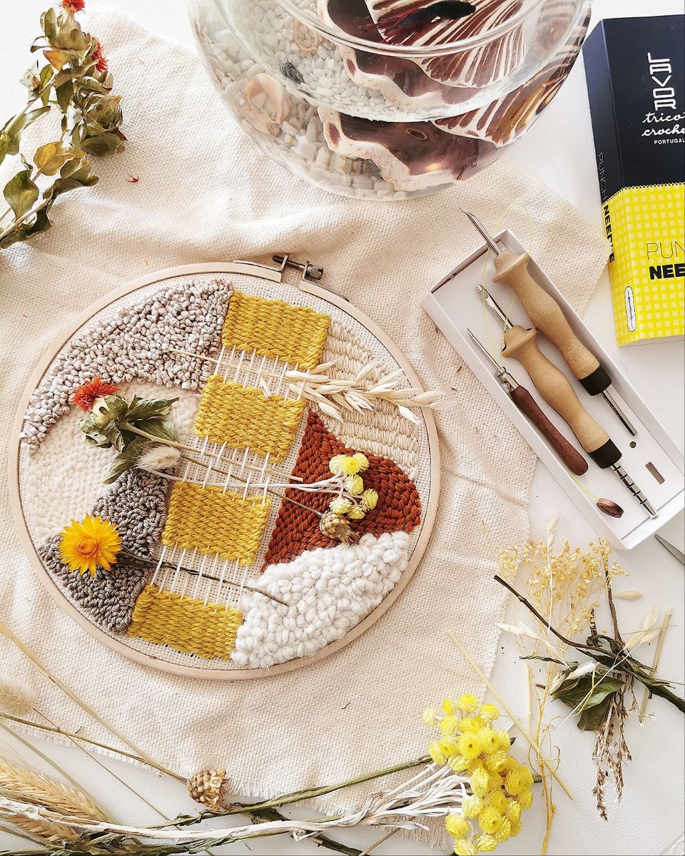 панно с разными фактурами и добавлением элемента "гобелена" с сухоцветами