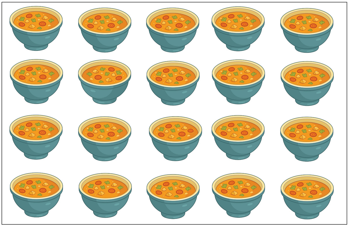 Сегодня для вас новое задание из раздела найдите 3 отличии. Перед вами поле одинаковых чашек супов, среди них есть 3 отличающихся. Найдите их пожалуйста.