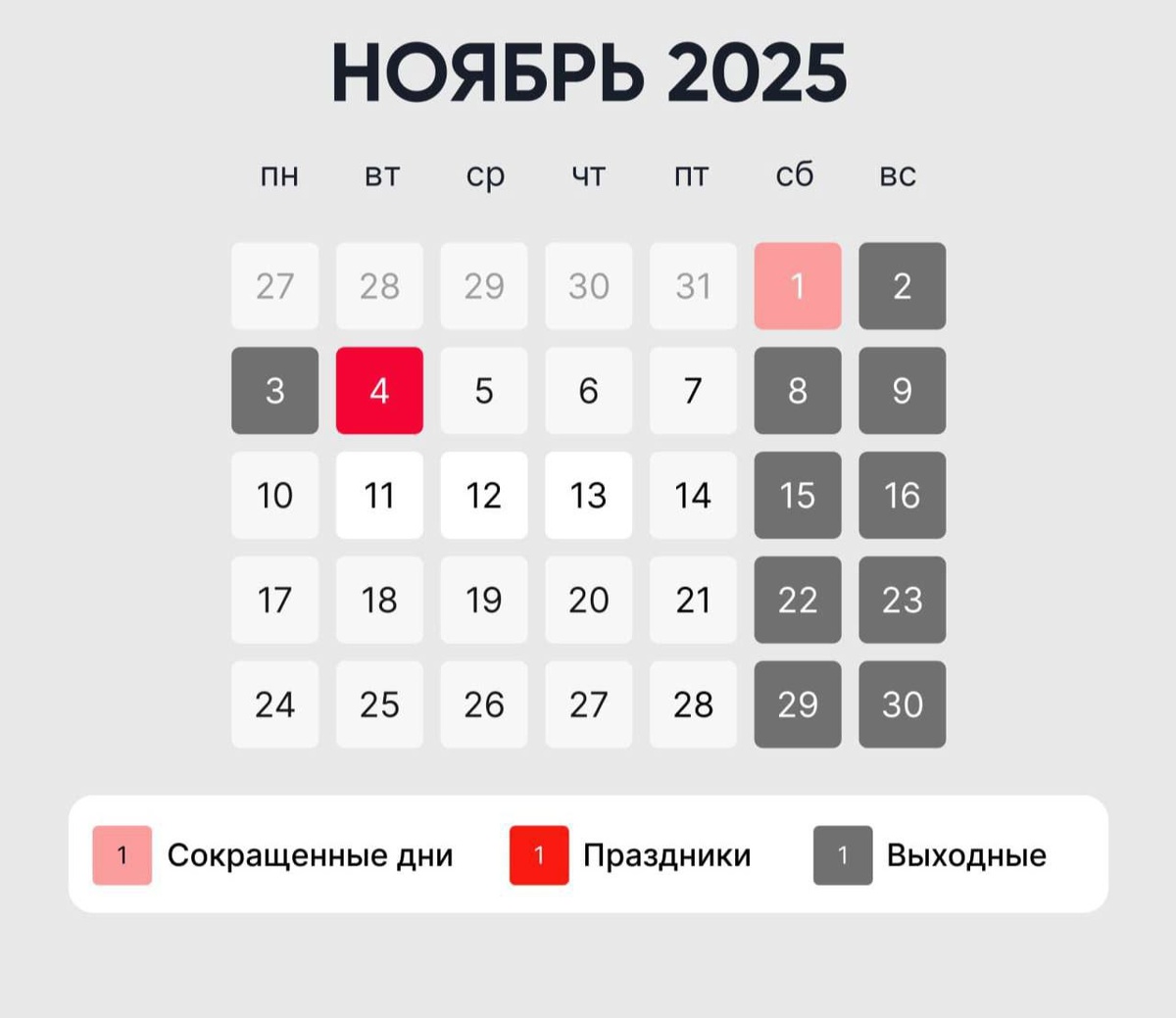 📆 Россиян в октябре ждет шестидневная рабочая неделя Рабочая суббота выпадает на 1 ноября, при этом выходной переносится на понедельник, 3 ноября. Суббота будет сокращённой. 🤩 Подписаться | Прислать новость | ВКонтакте | Дзен | Чат