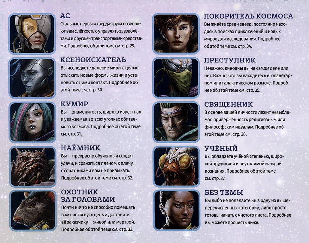 - Поддержи роль в партии. Нужен пилот? Бери тему про пилотирование. Хотите чтоб вас знали по всей вселенной? Подойдет Кумир. Готовитесь к экспедициям? Покоритель космоса/Ксеноискатель.