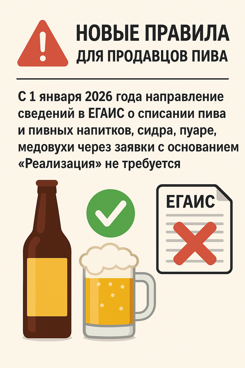 С 1 января 2026 года всех предпринимателей и организации, которые закупают пиво, сидр, пуаре, медовуху и другие пивные напитки для последующей розничной продажи, ждут важные изменения. Росалкогольтабакконтроль (ФСРАР) опубликовал разъяснение, которое касается взаимодействия двух государственных систем — ЕГАИС и ГИС МТ (Честный Знак). Разбираемся, что это значит на практике, зачем это нужно и что важно не пропустить. До этого момента предприниматели, продающие пиво и пивные напитки, должны были направлять сведения о продаже (реализации) продукции в ЕГАИС. Это делалось через так называемую заявку о фиксации с основанием списания «Реализация» — специальную электронную форму, утвержденную приказом № 397 от 17.12.2020. Но теперь, с 1 января 2026 года, отправлять такую заявку не нужно, если продукция подлежит обязательной маркировке в системе «Честный Знак». Почему? Потому что все данные о продаже маркированного алкоголя автоматически передаются из ГИС МТ в ЕГАИС. Повторно отправлять ту же и
