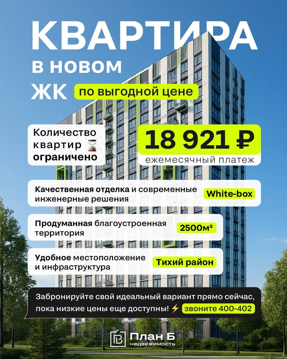 Знакомо чувство, когда смотрите на новый жилой комплекс — уютный район, дворы без машин, современные планировки — но кажется, что это слишком дорого? Вы откладываете покупку, цены растут, а лучшие квартиры разбирают😟 Хватит мечтать! Ваша квартира в новом жилом комплексе ждет вас и она доступнее, чем вы думаете!🔥🌆 Как найти именно ту квартиру, где будет комфортно вам, вашим детям и будет подходить по бюджету? Как не утонуть в десятках планировок и не переплатить? Как проверить все документы и быть уверенным в чистоте сделки? Время — деньги. А наше время для вас — бесплатно! Наши эксперты берут все эти заботы на себя: 🔍 Проанализируем все доступные квартиры в новостройках по вашим критериям (этаж, бюджет, планировка) и отберем 3-5 самых выгодных вариантов 🤝 Проконсультируем по семейной ипотеке: рассчитаем ежемесячные платежи и поможем одобрить ипотеку с комфортными условиями 💰 Предложим эксклюзивные условия: как официальные партнеры застройщика, мы часто знаем о специальных