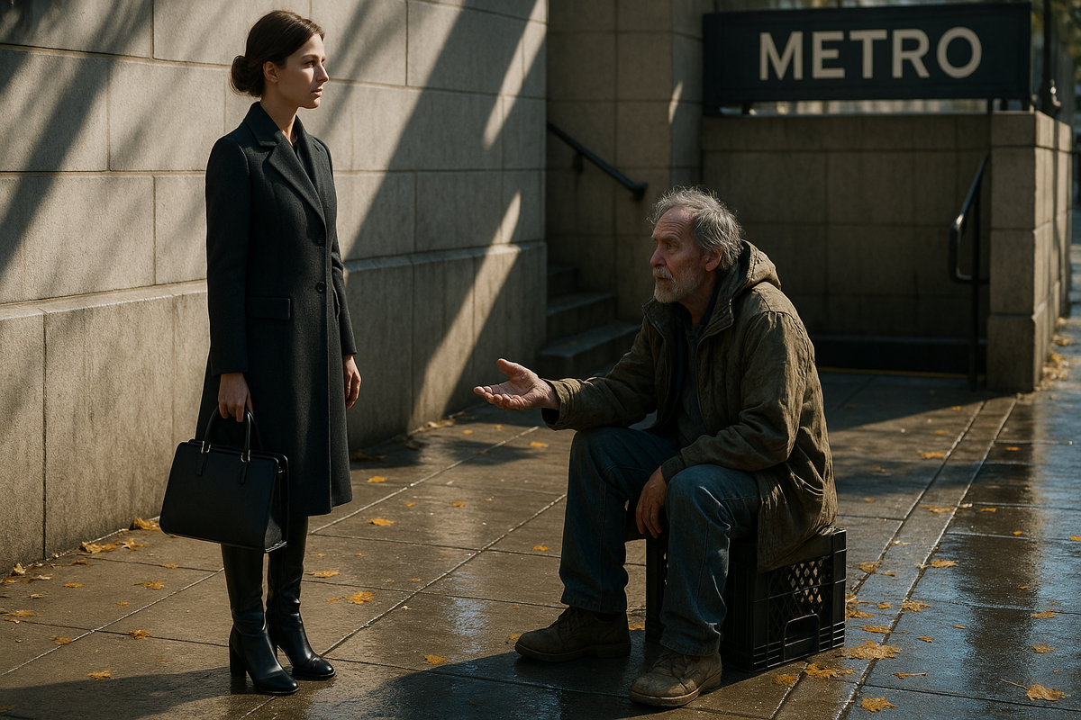 Он стоял у киоска с газетами. Потрёпанный, седой, в грязной куртке. Просил мелочь у прохожих.