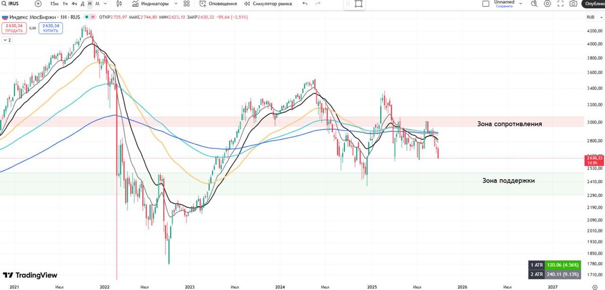🇷🇺 Акции падают. Говорим о перспективах в 2026 году На текущий момент, рынок акций $IMOEXF продолжает тестировать очередную поддержку: 2650 пунктов, пробой которой вновь отправит нас к декабрьским минимумам 2024 года - уровню 2500. Данная коррекция - результат негативных новостей со всех фронтов: в геополитике, в новых налогах и в риске увидеть затяжную высокую ставку. Многие компании показывают результаты хуже 2024 года, а будущие перспективы пока не дают позитивных взглядов. Такое колоссальное давление на экономику очень сложно пережить в затяжном горизонте. Минэк хоть и ожидает в 2026 году рост ВВП на 1,5%, но пока не понятно за счет чего. Если текущий год мы закроем дай бог ростом на 1%. Отсюда, на наш взгляд, самое логичное что может помочь: ☝️ Дальнейшее снижение ставки. Именно этот фактор, поможет стабилизировать рецессию в экономике и хоть как то поддержать налоговый план. Ведь если экономика катится вниз - логично что и налоговые отчисления (которые так нужны для закрыт