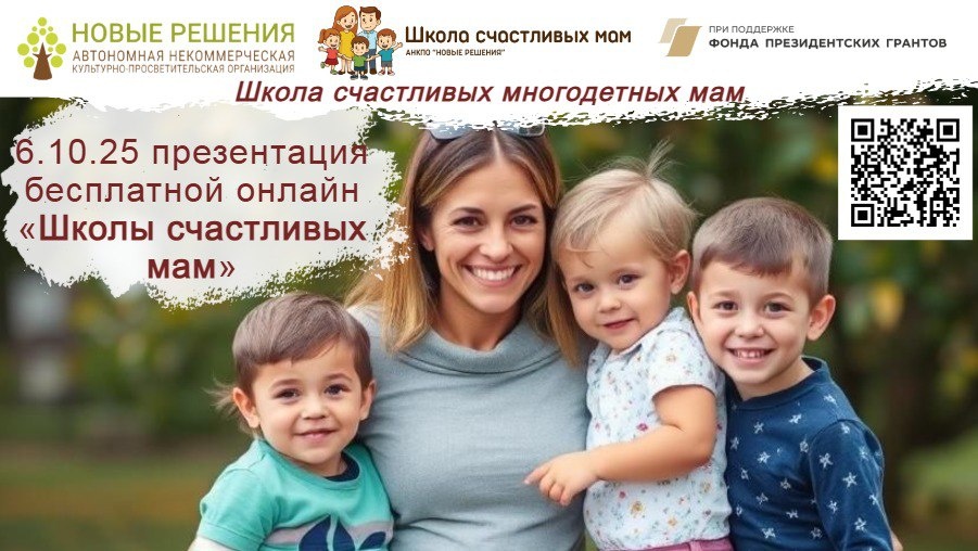 ПУСТЬ СЧАСТЛИВЫХ МАМ И ДЕТЕЙ БУДЕТ БОЛЬШЕ! Приглашаем вас в понедельник, 6 октября, в 12-00 мск на открытый вебинар-презентацию бесплатной онлайн «Школы счастливых мам»! 🔅В Школе мы научимся воспитывать детей без конфликтов, чувства вины и выгорания. Мы будем делиться успешным опытом и учиться не только у наставников Школы, но и у друг друга. ✅На занятии 6 октября мы рассмотрим: - организационные вопросы про образовательный марафон длиною в 8 месяцев; - возможные результаты и изменения в отношениях с собой, детьми и близкими, своим делом; - содержание программы Школы и перечень тех проблем в воспитании детей, которые она поможет решить; - знакомство с командой проекта и выбор психолога-наставника Школы, в чьей группе вы хотели бы заниматься; - ответы на ваши вопросы. Занятие проведут Калашникова Наталья Григорьевна, доктор пед. наук, профессор, автор и руководитель проекта, и сертифицированные психологи-наставники. ❗Для участия необходимо зарегистрироваться. Используйте QR-код и