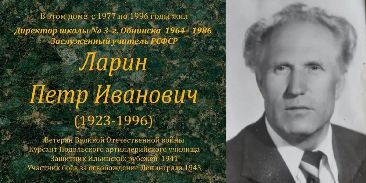 ✏️ В Обнинске установят мемориальную доску Петру Ларину Решение 2 октября принято на заседании Собрания города. Доска появится на фасаде дома №1 на Треугольной площади, где жил Петр Иванович Ларин. Он был одним из подольских курсантов. Участвовал в боях на Ильинских рубежах во время Великой Отечественной войны в 1941 году. Больше 20 лет Ларин руководил школой №3.