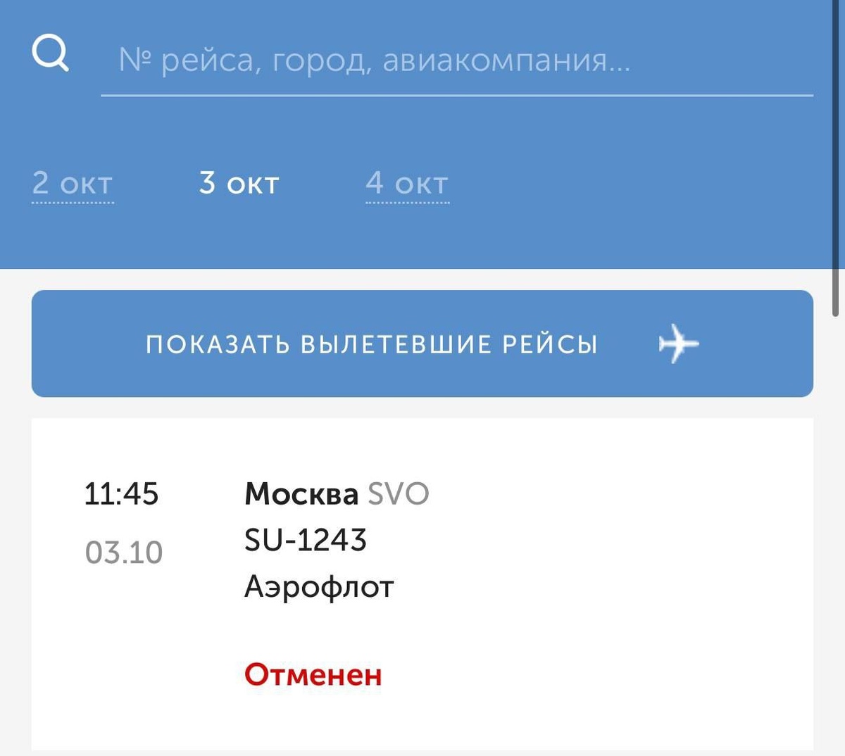 Рейс из Оренбурга в Москву, вылетавший в 11:45, отменен. Обратный рейс также не состоится.