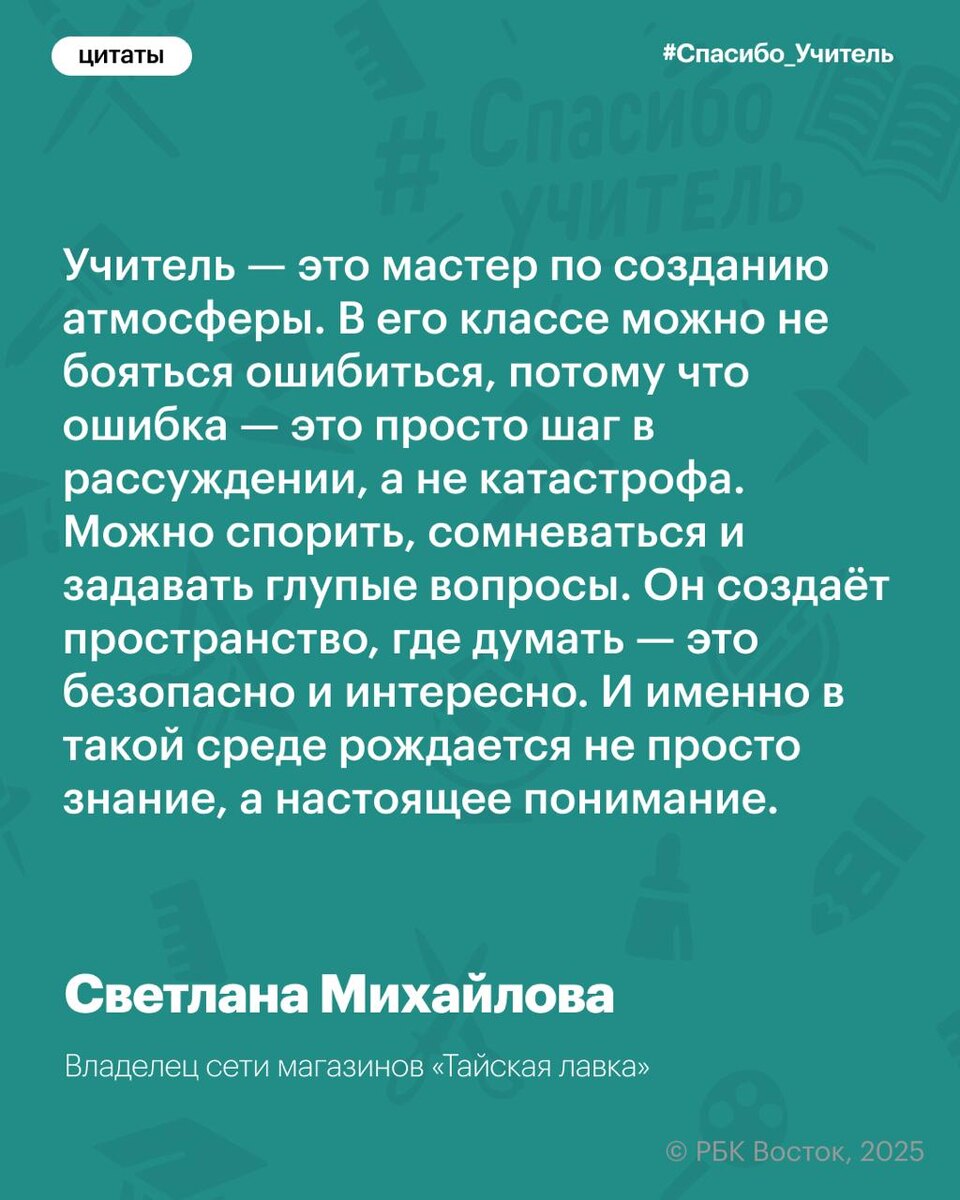 😀😀😀 «Новые люди» в Приморье и РБК Восток продолжают спецпроект #Спасибо_Учитель, в рамках которого мы рассказываем, как бизнес Владивостока поздравляет учителей города с их профессиональным праздником На этот раз с РБК Восток побеседовала владелица сети магазинов «Тайская лавка» Светлана Михайлова. По ее словам, компания подготовила учителям праздничные наборы с бытовой химией, косметикой и тайскими конфетами. 😃Подписывайтесь на РБК Восток