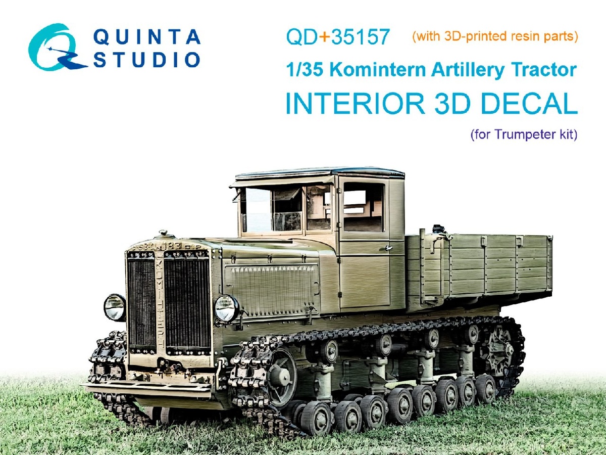 Quinta modelling studio из Пензы выпустила "трехмерную декаль" и выращенные на 3D-принтере детали для модели артиллерийского тягача "Коминтерн" в масштабе 1/35 от Trumpeter: Komintern Artillery Tractor (каталожный номер QD+35157) ==========================≠===== Quinta modelling studio из Пензы выпустила "трехмерную декаль" для деталировки кабины модели P-38L Lightning в масштабе 1/48 от Hasegawa: P-38L Lightning (каталожный номер QD48644) ================================ Московская Red Iron models показала рендеры шасси будущей модели трактора К-700 "Кировец", которая будет выпускаться на 3D-принтере в масштабах 1/35 и 1/43. ================================ ENGINEERING MINIATURES из Красноярска выпустила на 3D-принтере фигуру советского танкиста 1943-1945 годов в масштабе 1/35. ================================ Quinta modelling studio из Пензы выпустила "трехмерную декаль" и выращенные на 3D-принтере детали для кабины модели позднего МиГ-21БИС в масштабе 1/72