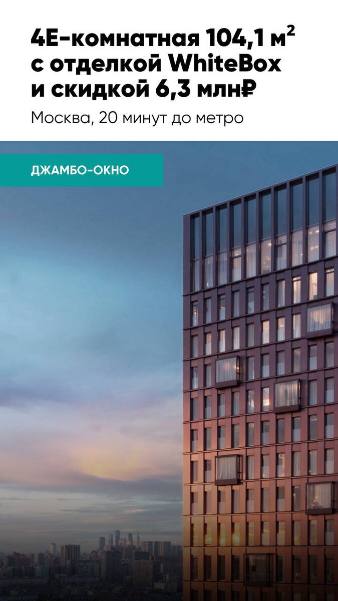 Расширим свои горизонты обзора через джамбо-окно? Что это такое? На первой фото их видно очень хорошо - они выделяются на фасаде здания: * Джамбо-окна - это масштабные светопрозрачные конструкции из крупногабаритного стекла. Термин «джамбо» пришёл из английского языка (jumbo) и обозначает нечто очень большое, монументальное. Основные преимущества джамбо-окон: — Эстетика. Минимум видимых профилей, максимум света и пространства. — Энергоэффективность. Современные джамбо стёкла обладают высокими теплоизоляционными свойствами. — Надёжность. Благодаря специальной обработке джамбо стёкла обладают повышенной прочностью. — Акустический комфорт. Крупногабаритные стеклопакеты обеспечивают отличную звукоизоляцию. Что если мы скажем, что прямо у Павелецкой набережной можно купить 4Е-к.кв с такими уникальными джамбо-окнами*, а ещё и с супер скидкой 6,3 млн₽?🔝 😛О локации: Даниловский район • м. Тульская — 20 минут пешком 😗Особенности проекта: • Всего несколько минут от Павелецкой набережной
