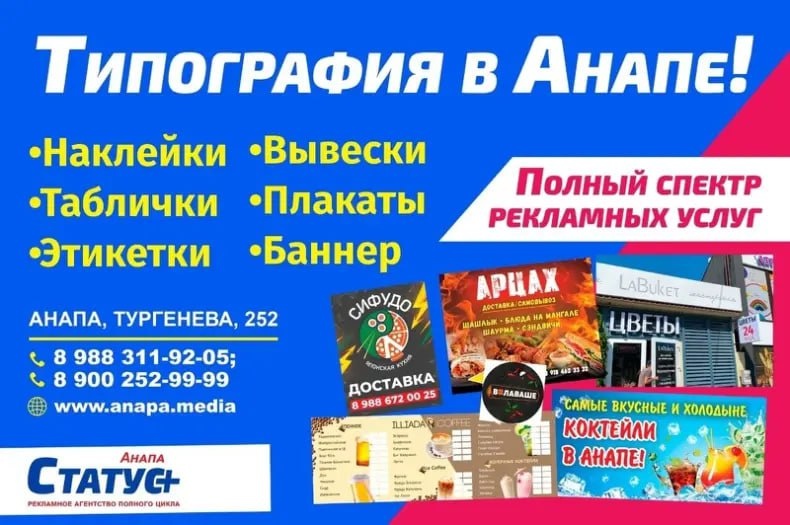 ❗️Типография в Анапе! Изготовление рекламы!💥 💥Баннеры, самоклеющаяся плёнка, наклейки, таблички из пластика, вывески, оформление кафе, магазинов, гостиниц...в Анапе! 💥Визитки, флаеры, листовки, буклеты, плакаты, меню, ценники, пригласительные....в Анапе! 💥Брендированные майки, фартуки, флаги, банданы... 💥Дизайн! 💥Замеры и монтаж на объекте заказчика. ❗️Скидки! 📲Обращаться по телефонам: 8-988-311-92-05, 8-900-252-99-99. #РекламаАнапа #ТипографияАнапа #ВизиткиАнапа #ФлаераАнапа #БуклетыАнапа #БаннераАнапа #НаклейкиАнапа #ВывескиАнапа #ИзготовлениеРекламыАнапа #АнапаМедиа #АнапаРеклама #ТипографияВАнапе #ИзготовлениеВывесокАнапа #ПолиграфияАнапа #ТабличкиАнапа #ПилоныАнапа #НаклейкиАнапа #БилбордыАнапа #Анапа #АнапаМедиа