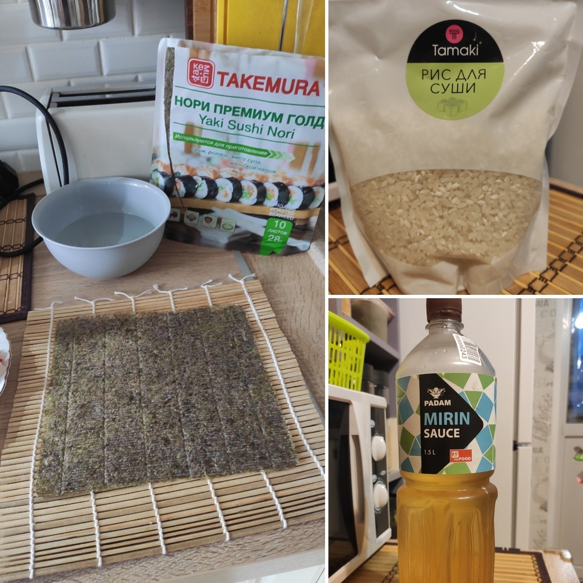 К домашним роллам я относилась скептически. Я была уверена, что нужен особый рис, да и нужную рыбу не достать, но выложив в очередной раз кругленькую сумму за роллы из доставки - я загорелась идеей приготовить роллы самой и стала изучать вопрос. Рис, водоросли нори, вино "Мирин" и соусы: ореховый, терияки, унаги и апельсиновый нашла на озоне. Для начинки использую слабо-соленую сёмгу, крабовые палочки, огурцы, сливочный сыр, икру мойвы в соусе, креветки и мидии. Из 500г сухого риса получается 10 колбасок-роллов. Рис промыть холодной водой 3-5 раз. 500г риса залить 580г холодной воды, закрыть крышкой и поставить варить. Как только закипит - убавить нагрев ( с 9 уровня нагрева я ставлю на 4). От закипания рис варить 10 минут, не открывать крышку и не перемешивать. Через 10 минут снять с плиты, снять крышку, накрыть махровым полотенцем и опять накрыть крышкой на 20 минут для сбора влаги. Снять полотенце и заправить горячий рис. Заправка: на 500 г риса 2 чайные ложки соли, 2 столовые лож