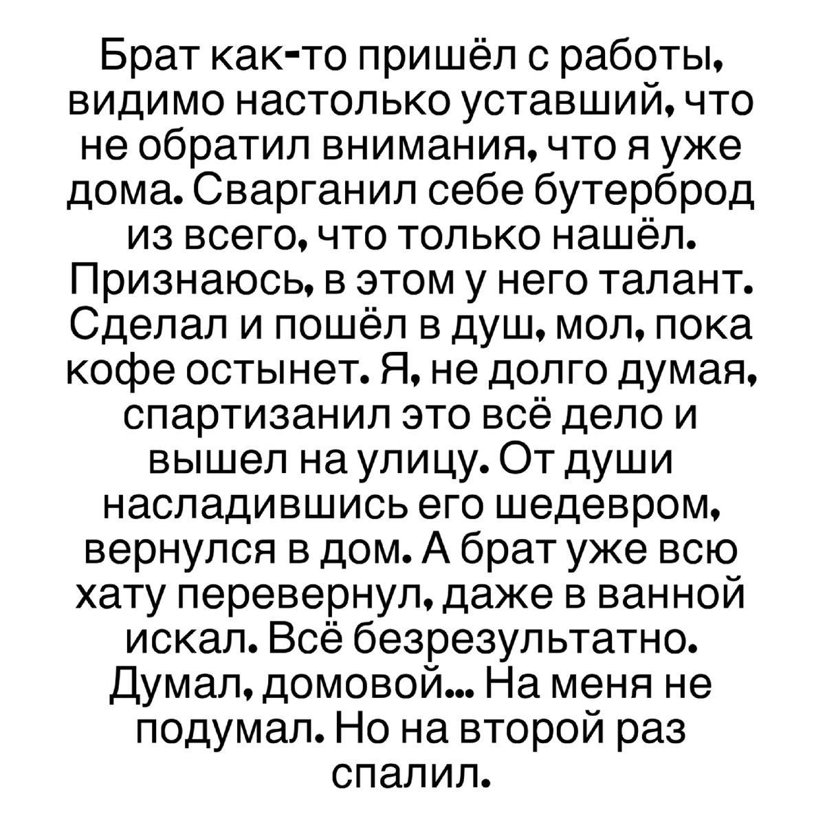 Брат как-то пришёл с работы, видимо настолько уставший, что не обратил внимания, что я уже дома. Сварганил себе бутерброд из всего, что только нашёл. Признаюсь, в этом у него талант. Сделал и пошёл в душ, мол, пока кофе остынет. Я, не долго думая, спартизанил это всё дело и вышел на улицу. От души насладившись его шедевром, вернулся в дом. А брат уже всю хату перевернул, даже в ванной искал. Всё безрезультатно. Думал, домовой... На меня не подумал. Но на второй раз спалил.