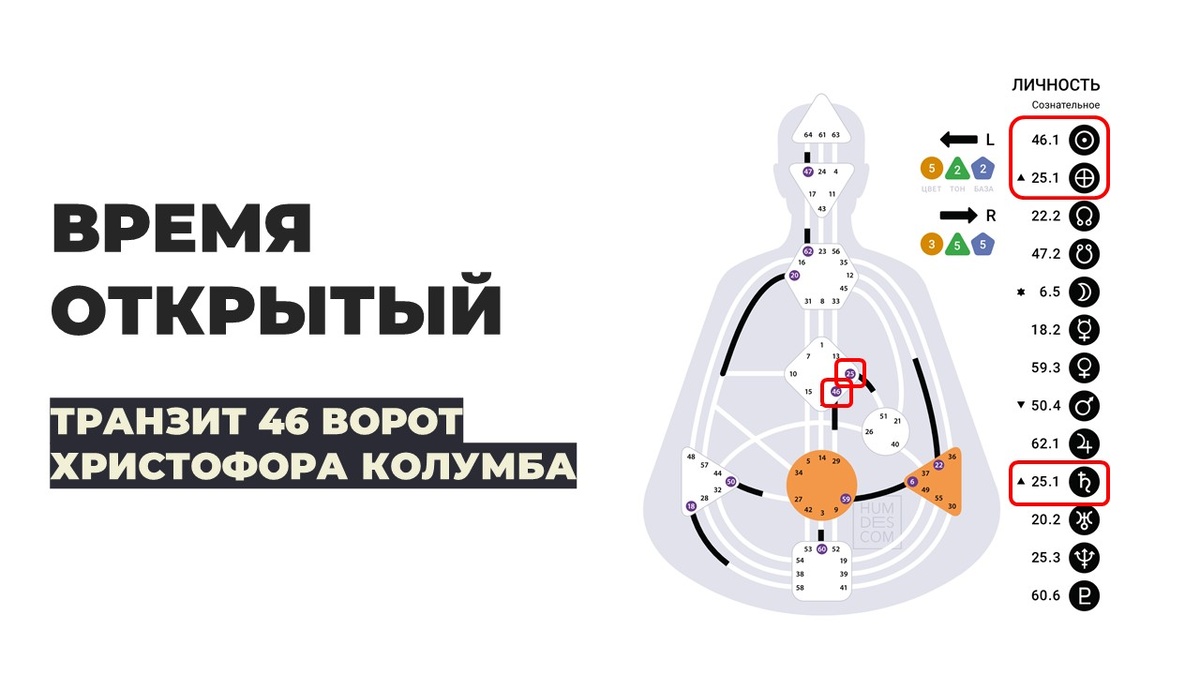 Вернемся к 46-м воротам. Их часто называют воротами Христофора Колумба. Он искренне пустился в путешествие в надежде найти новый торговый путь, но в итоге открыл Америку. Сам того не подозревая. Делай то, что можешь, а результат придет сам по себе, как счастливая неожиданность. В эти дни практикуйте осознанность: замечайте свои действия, чувства, реакции. Задайте себе вопрос: "Действую ли я из любви к себе и своему пути, или из желания доказать что-то другим?" Позвольте себе быть в моменте, и вы увидите, как энергия транзита раскроет перед вами новые горизонты.