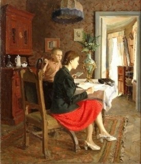Иван Александрович Гринюк (1915, деревня Блевчицы, БССР - 1995), в годы Великой Отечественной войны воевал под Москвой в 11-й ополченческой дивизии г. Москвы. Пехотинец, рядовой. С 1943 года участвует в художественных выставках. В 1944 году художник был принят в члены Московской Организации Союза Советских Художников. Был награжден орденом Отечественной войны II степени, медалями «За доблестный труд в Великой Отечественной войне 1941—1945 гг.». Участник выставок с 1943 года. Многократно награждался дипломами МОСХ РСФСР. Автор портретных и пейзажных серий, создаваемых в результате творческих поездок по Белоруссии, Кубани, Казахстану, русскому Северу. "После экзамена", 1947 Холст / масло