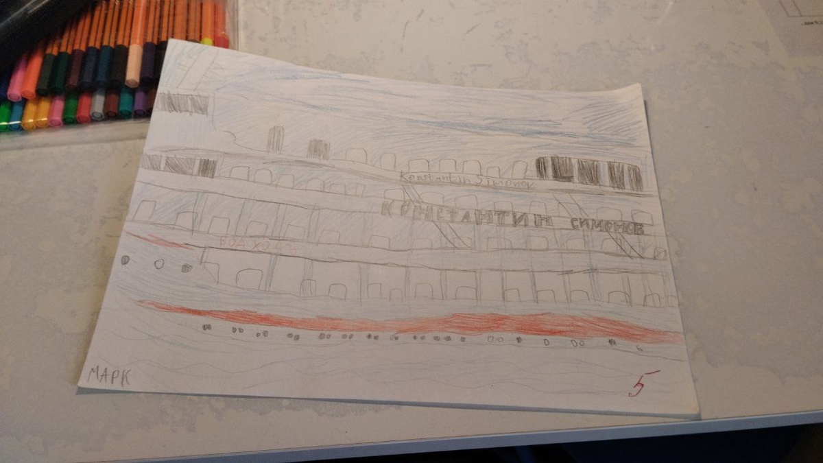 Наш внук Марк Захаров на уроке рисования изобразил своё летнее путешествие на теплоходе "Константин Симонов" с дедом и бабушкой. За что и получил твёрдую "пятёрку"! #водоходъ #теплоходконстантинсимонов #ВтороеДыхание