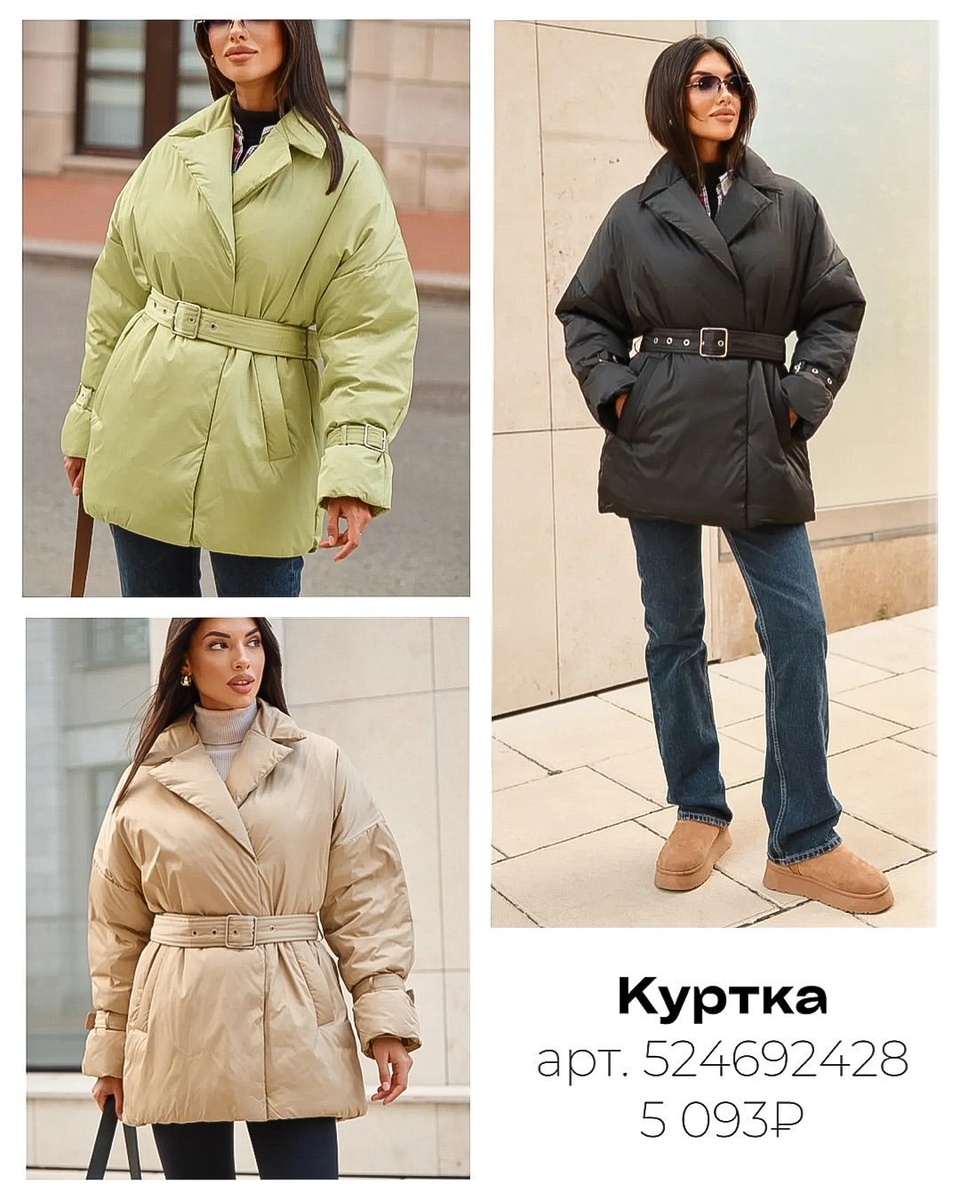 Что это: тёплая укороченная пуховка с «жакетной» посадкой: широкий лацкан, спущенное плечо, объёмный рукав с ремешком на манжете и пояс, который собирает талию. Длина закрывает бедро — самое универсальное решение на каждый день. На фото — три оттенка: спокойный бежевый, строгий чёрный и свежий лаймово-фисташковый.