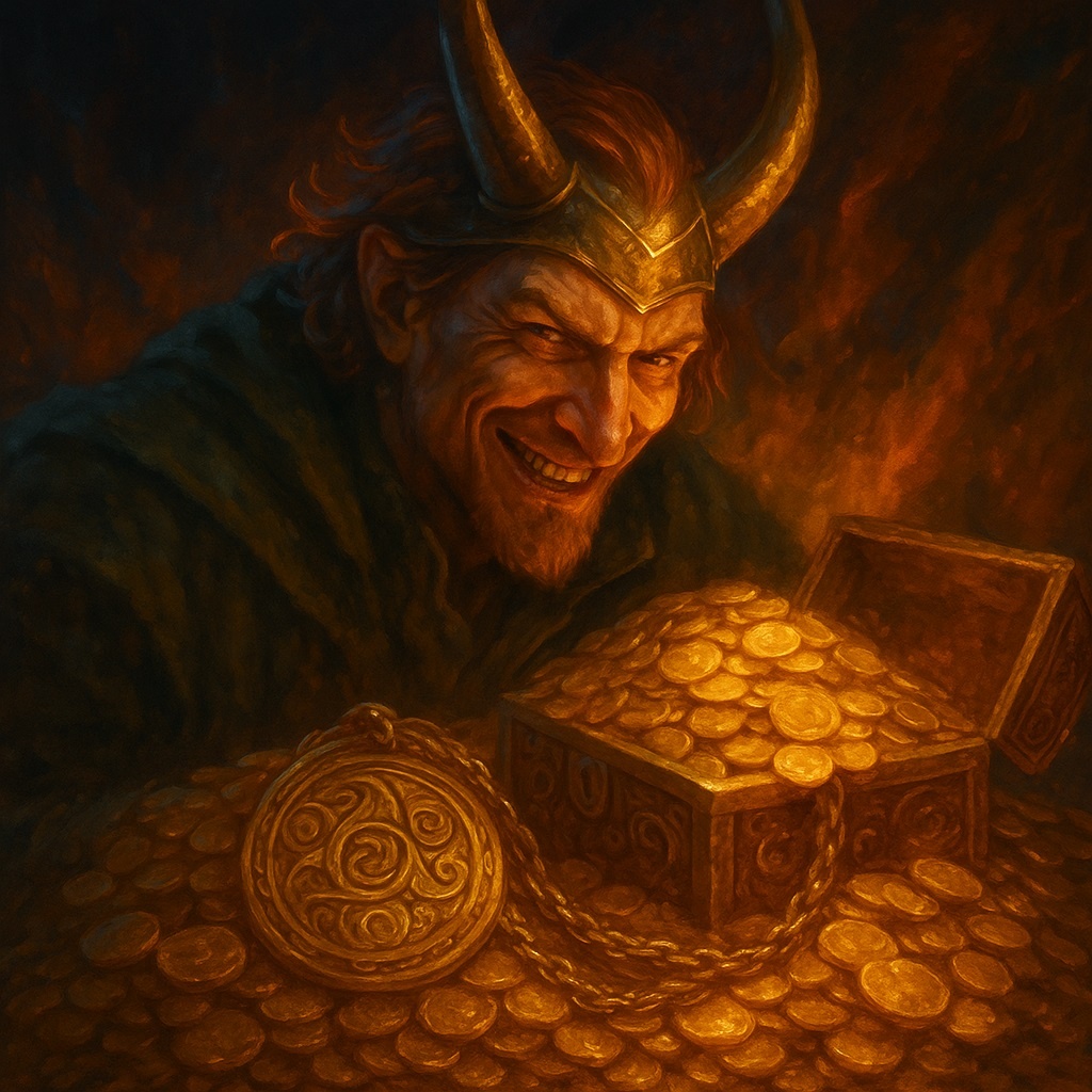 Но здесь скрыта ловушка: богатства Локи никогда не доставались ему надолго. Он был вечным посредником, вором, манипулятором. Сокровища он приносил богам, но не себе. И финал его истории печален: прикованный цепями, он стал символом наказания за хитрость.