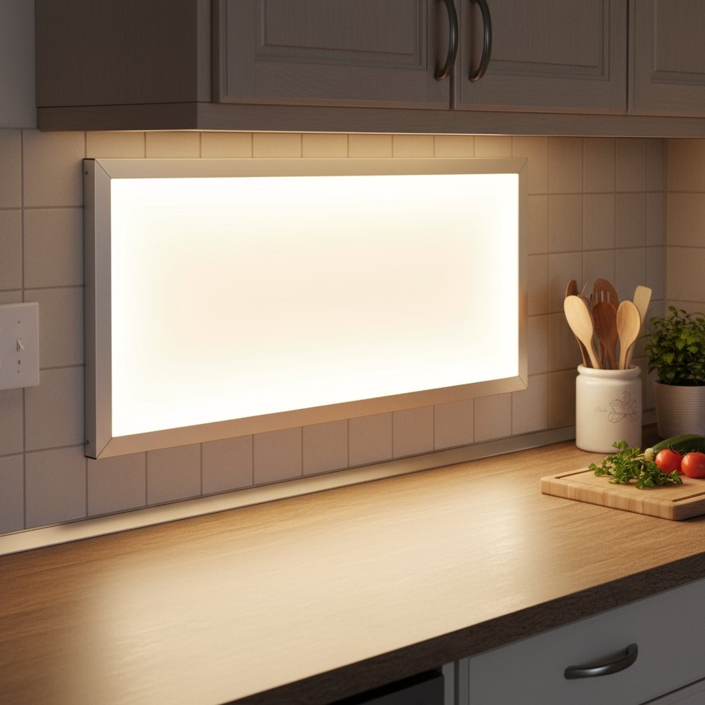 Меня достали пятна света от спотов: режешь на доске - половина в тени, половина слепит. Поставил плоский лайтбокс: матовый акрил, алюминиевая рамка, тёплая лента. Визуально - как окно над фартуком. Ровный свет по всей столешнице, никаких «лучей в глаза», и выглядит аккуратно. Раскладываю по шагам - без заумных конструкций.
