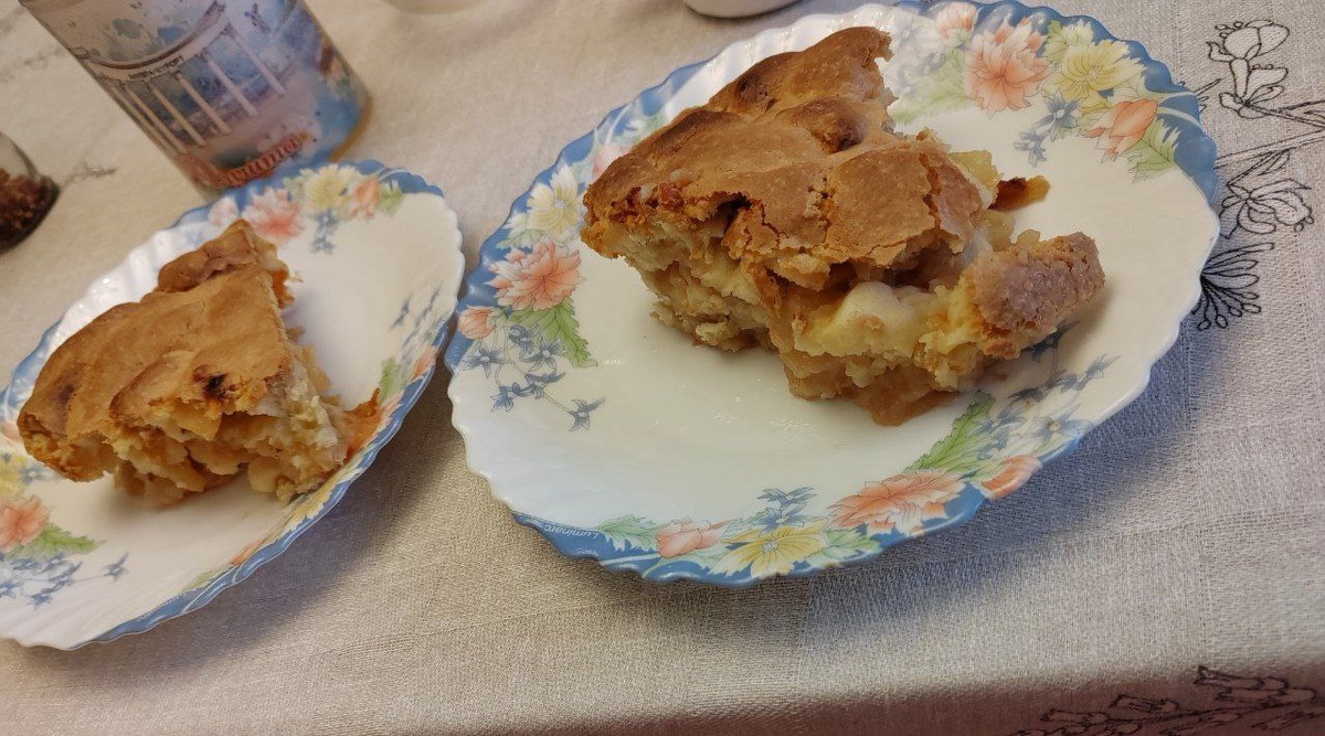 Бабушка 👵 приготовила шарлотку , сидим пьем с вкусняшкой чай 🍵