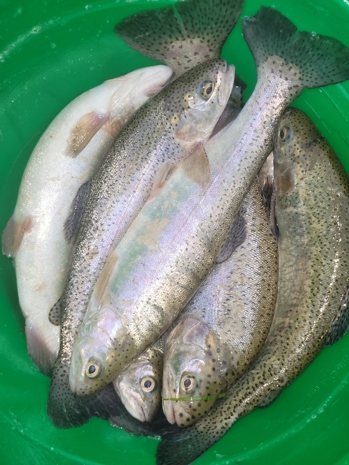Остатки форели из бассейна. Итог: была (в среднем) по 200 гр. С 13 мая по 21 сентября (4 месяца) стала (в среднем) по 500 гр. Пару экземпляров было по 700 гр. Ели с июня. Наморозили на зиму штук 40 (самую крупную). Икра была штуках в 10, но малепусенькая. К следующему лету наверное выросла бы, но дачный сезон окончен и пора в город перебираться... траты на корм и электроэнергию, и всякие приблуды привели к сумме в 1500 рублей за кг. В прошлый новый год покупали форелину по 2000 за кг. Мясо у нашей форели получилось белое, добавками не кормили, но жирное и вкусное. Подписаться на Пикабу Познавательный. и Пикабу: Истории из жизни.