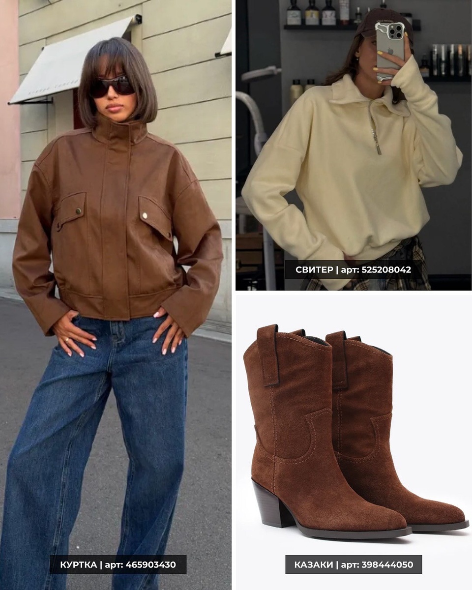 Карамельные и молочные оттенки в одной подборке — идеальный рецепт тёплого и очень актуального гардероба. Я разобрала каждый предмет с фото строго по порядку артикулов и добавила практичные советы стилиста: посадка, как комбинировать и на что обратить внимание при выборе. Что это: укороченная кожаная (эко) куртка цвета «горький шоколад» с высоким воротником и накладными клапанами. Плотная, держит форму, внизу — аккуратная кулиска для посадки по талии. Посадка и эффект: длина до линии талии балансирует широкие джинсы и визуально вытягивает ноги. Жёсткая фактура «собирает» силуэт и делает образ архитектурным. С чем носить: прямые/wide джинсы синего индиго, молочный лонгслив или тот самый «полузип» ниже; днём — кроссовки, вечером — казаки. Совет стилиста: застёжку носите на одну-две молнии ниже шеи, чтобы показать слои под курткой — образ станет «дороже». Что это: мягкий молочный трикотаж с короткой молнией, без лишних деталей. Рукав чуток удлинён — модный «перехлёст» на запястье. Посадк