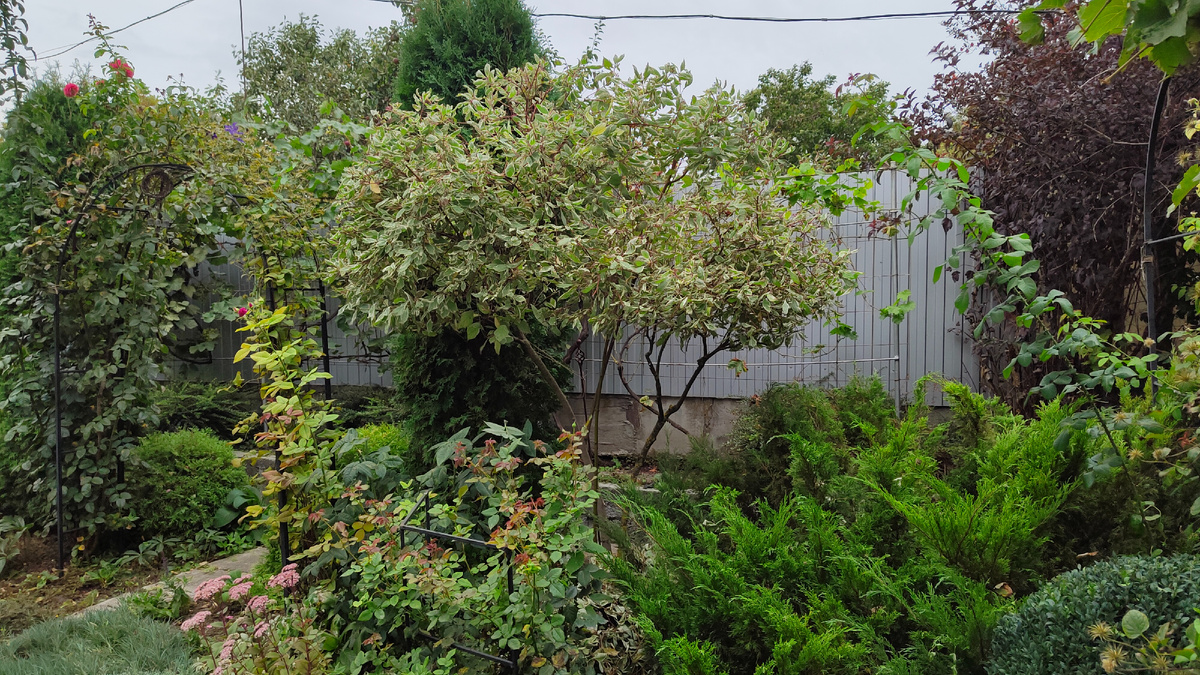 Чем занимаюсь сейчас в саду? Наверстываю летнее безделье: в жару было не до прополок и обрезок, все силы уходили на полив. А сейчас началась горячая пора. На днях я привела в порядок свой дерен Элегантиссима, сделала из него модный сейчас зонтик. Ножки ему оголила и срезала более половины куста, а то он уже разлегся и на соседку розу и на можжевельник. Получилось симпатично.