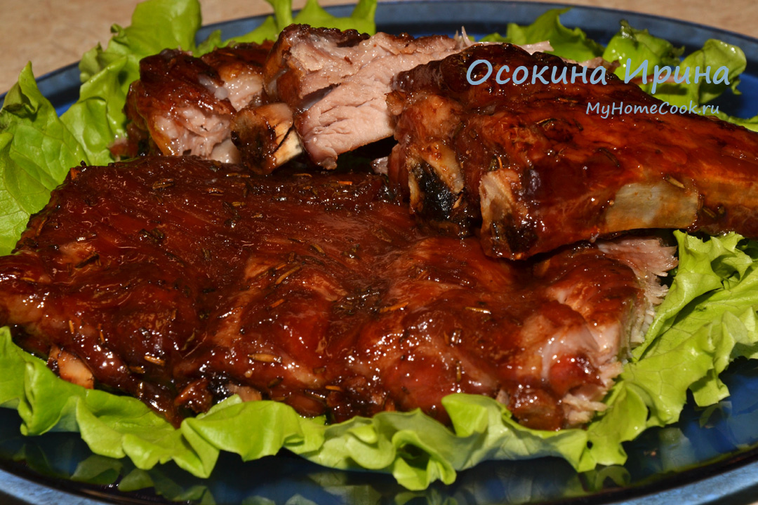 2 ленты свиных рёбер зачистила от плёнок, обсыпала копчёной солью с розмарином и чесноком (25г) и натёрла хорошенько со всех сторон, уложила в форму и убрала на ночь в холодильник. Сегодня форму достала за час до готовки, обернула двумя слоями фольги и поставила в духовку, разогретую до 150 градусов, на 2 часа 30 минут. В ковшике смешала 2 ст.л. соевого соуса, 2 ст.л. яблочного уксуса и 120 г коричневого сахара, поставила на огонь, промешала, довела до кипения и растворения сахара и сняла с огня. По истечении времени достала форму, сняла фольгу и густо смазала частью подготовленной глазури, после чего поставила на духовку под гриль на 15 минут, несколько раз смазывая оставшейся глазурью. Бесподобно, безумно, безапелляционно вкусно! Хрустящая глазированная корочка и сочнейшее, нежнейшее мяско под ней) Приятного аппетита
