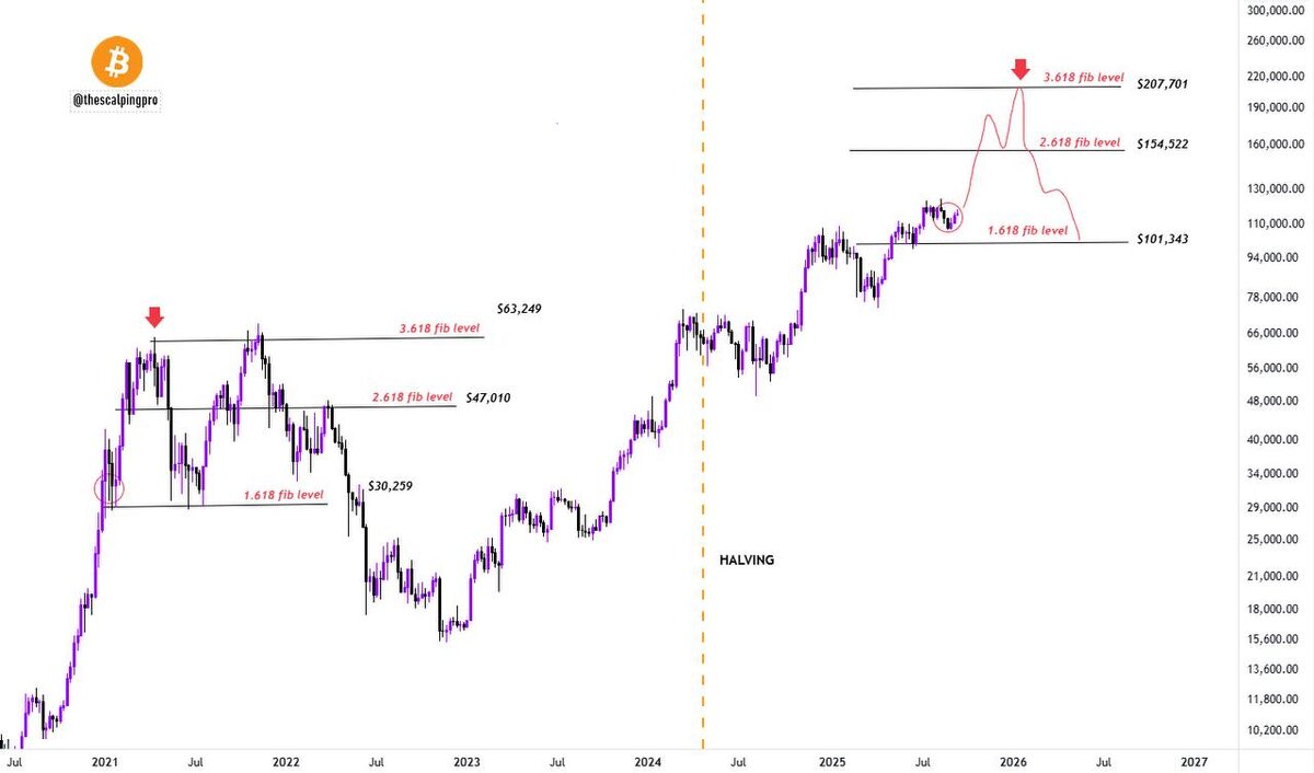 Bitcoin на пути к $207,701? 🤔 Фибоначчи снова в центре внимания. В прошлый цикл Биткойн остановился ровно на уровне 3.618 Fib — и это стало историческим пиком. Что сейчас? — Цена уверенно держится выше 1.618 Fib ($101,343). — Следующая серьёзная остановка — 2.618 Fib ($154,522). — А главный рубеж сопротивления цикла — 3.618 Fib ($207,701). Сценарии: — Медвежий: остановка и пик в районе $154,522. — Бычий: прорыв к $207,701 и новая глава ценовой истории. Ключевая мысль: рынок цикличен, и уровни Фибоначчи — это не магия, а карта, по которой трейдеры ищут точки жадности и страха. Хотите сделаю отдельный разбор, как именно Фибоначчи работал в прошлых циклах Биткойна и где лучше фиксировать прибыль в этот раз? Отметьте реакцией. Это поможет вам выстроить стратегию выхода без паники и лишних эмоций. #bitcoin #fib #крипторынок #цикл