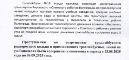 Речь идет о разворотном кольце на конечной станции на улице Тополевой и примыкающих линиях. В сегодняшнем сообщении федерального следком говорится, что глава СКР Бастрыкин затребовал доклад о результатах проверки в связи с обращением о ненадлежащей транспортной инфраструктуре в Волгограде. Активисты указали в обращении не только то, что они не согласны с ликвидацией троллейбусного движения в Кировском районе, но и то, что демонтаж разворотного кольца на конечной на Тополевой был выполнен с августа по сентябрь этого года. Также были разрушены примыкающие линии. Как результат – участок контактной сети разрушен, специальное оборудование – похищено. Волгоградцы продолжают отстаивать свое право передивгаться на троллейбусе до Советского района: - По мнению граждан, указанные действия повлекли причинение ущерба бюджету, а также нарушили их право на транспортное сообщение, поскольку они лишились возможности передвигаться по доступному маршруту, соединяющему Кировский и Советский районы. Обращ