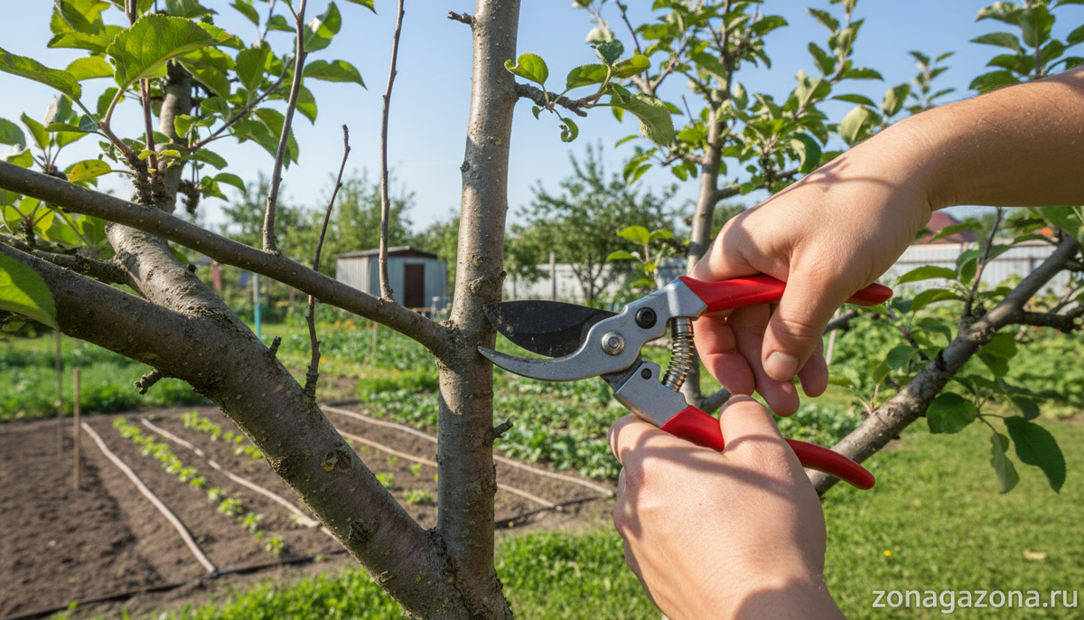 Каждый садовод хотя бы раз сталкивался с волчками на яблоне. Эти побеги легко узнать: они растут вертикально, стремятся в небо и сильно выбиваются из общей формы кроны. На первый взгляд кажется, что дерево стало мощнее и здоровее, но на деле такие ветви пользы не приносят. Волчок редко закладывает плодовые почки, а вот сил у яблони отнимает много. Если оставить их без внимания, крона превращается в густой клубок, свет вглубь почти не попадает, а урожай заметно снижается. Именно поэтому обрезка волчков — обязательный элемент ухода за садом. Волчки — это своеобразная реакция дерева на стресс. Чаще всего они вырастают после сильной обрезки, когда у яблони убрали слишком много ветвей. Дерево пытается компенсировать потерю и выбрасывает целый лес новых побегов. Есть и другие причины: Зная причины, проще предупредить их появление, чем потом бороться с целой шапкой ненужных ветвей. Сроки зависят от состояния дерева и сезона. Самый эффективный вариант — совмещать весеннюю и летнюю работу. Тогд