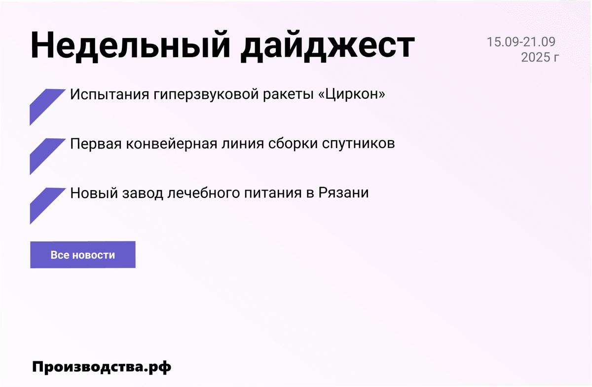 На прошедшей неделе российская промышленность показала значительные достижения в ключевых отраслях. В Железногорске запустили первую в стране конвейерную линию сборки спутников, что открывает возможности для серийного производства космических аппаратов. Северный флот успешно испытал гиперзвуковую ракету «Циркон», подтвердив высокий уровень развития ОПК. В гражданском секторе отмечен разнообразный прогресс — от открытия производства лечебного питания до локализации автокомпонентов и возрождения бывшего завода Bosch под российским брендом.