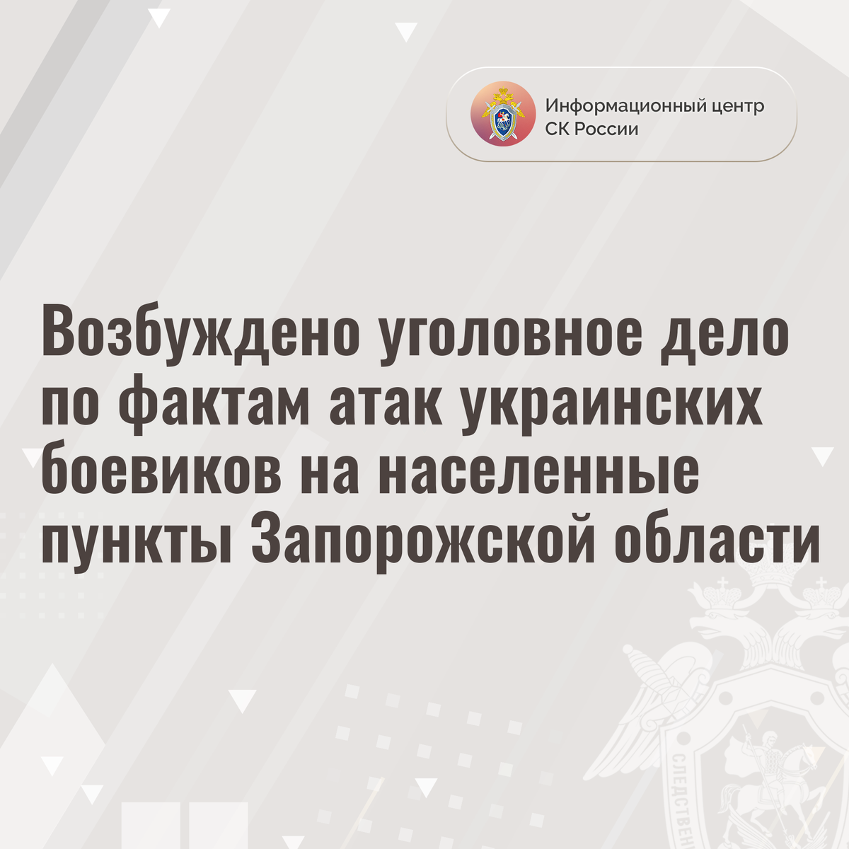 Главным следственным управлением СК России по фактам атак украинских вооруженных формирований на населенные пункты Запорожской области возбуждено уголовное дело по признакам преступлений, предусмотренных ч. 2 ст. 105; ч. 3 ст. 30, ч. 2 ст. 105; ч. 2 ст. 167 УК РФ (убийство и покушение на убийство, умышленное повреждение и уничтожение имущества).