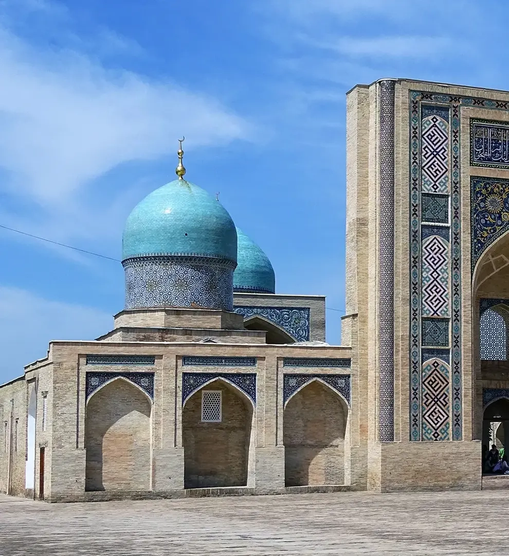Место это называется площадь Амира Тимура, которого мы знаем как Тамерлана. Правее гостиницы вы увидите музей истории Тимуридов — причудливое круглое здание с голубым куполом, построенное в стиле, который получил название узбекский сейсмический модернизм. Амир Тимур был полководцем, в музее, соответственно, много доспехов, но и не только — представлены ювелирные изделия, музыкальные и астрономические инструменты и другие культурные ценности, восходящие к эпохе Тимуридов.