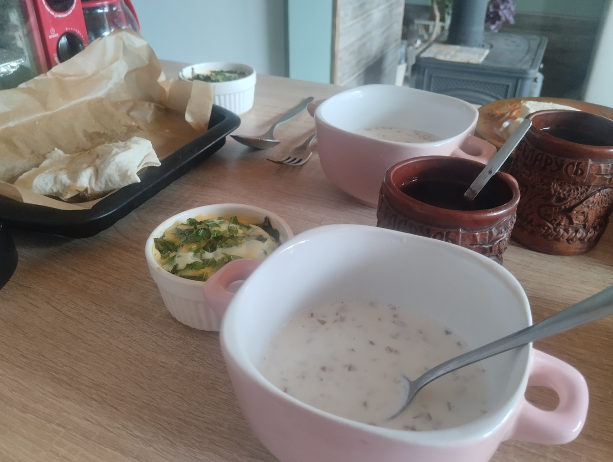 Каша гречневая с молоком, омлет с помидорами, зеленью, сосисками и по пирожку с зеленью и сыром из лаваша.