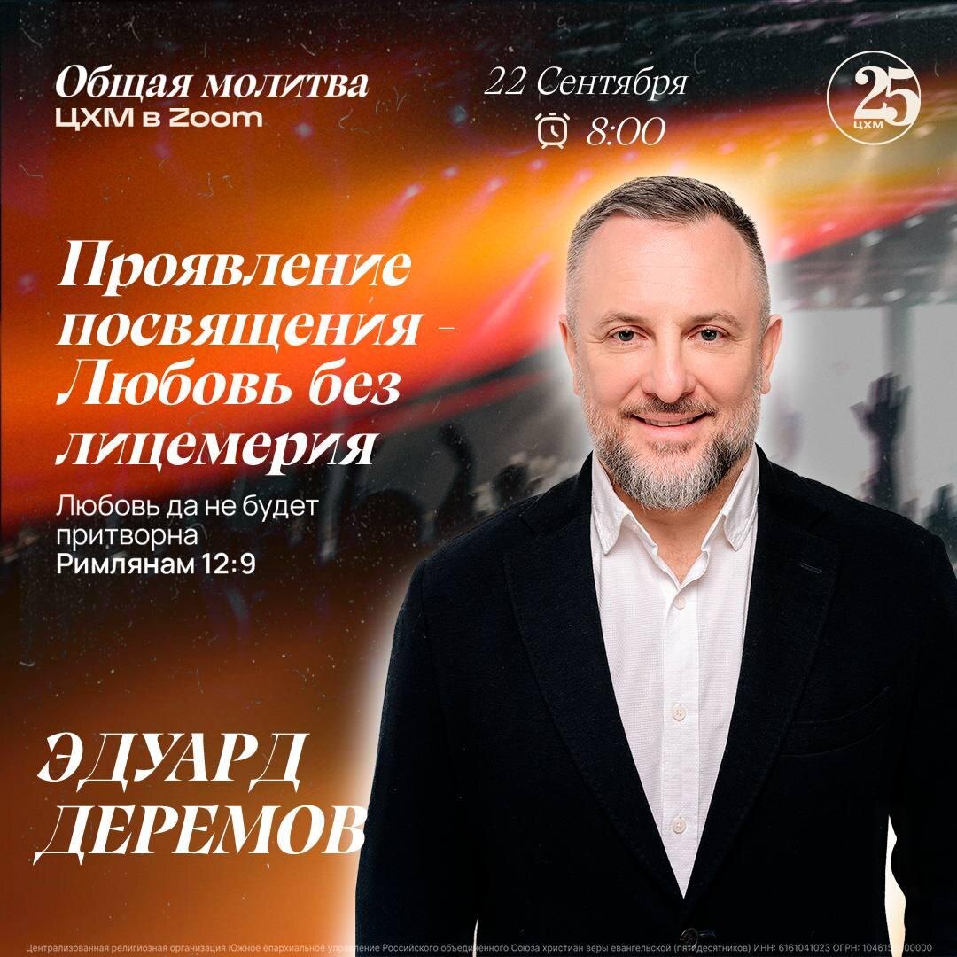 В завершающий день утренней молитвы с нами будет Эдуард Деремов 🤓 Тема: «Проявление посвящения – Любовь без лицемерия» 22 сентября / 8:00 / Zoom «Ибо никто из нас не живёт для себя, и никто не умирает для себя: живём ли – для Господа живём; умираем ли – для Господа умираем. И потому, живём ли или умираем – всегда Господни. Ибо Христос для того и умер, и воскрес, и ожил, чтобы владычествовать и над мёртвыми, и над живыми.» (Римлянам 14:7–9) Посвящение проверяется не на сцене, а в обычных отношениях: – в почтительности, – терпении в скорбях, – постоянстве в молитве, – гостеприимстве, – и даже в умении благословлять тех, кто причиняет боль. 📌 Ссылка на Zoom доступна у лидера вашей домашней группы.