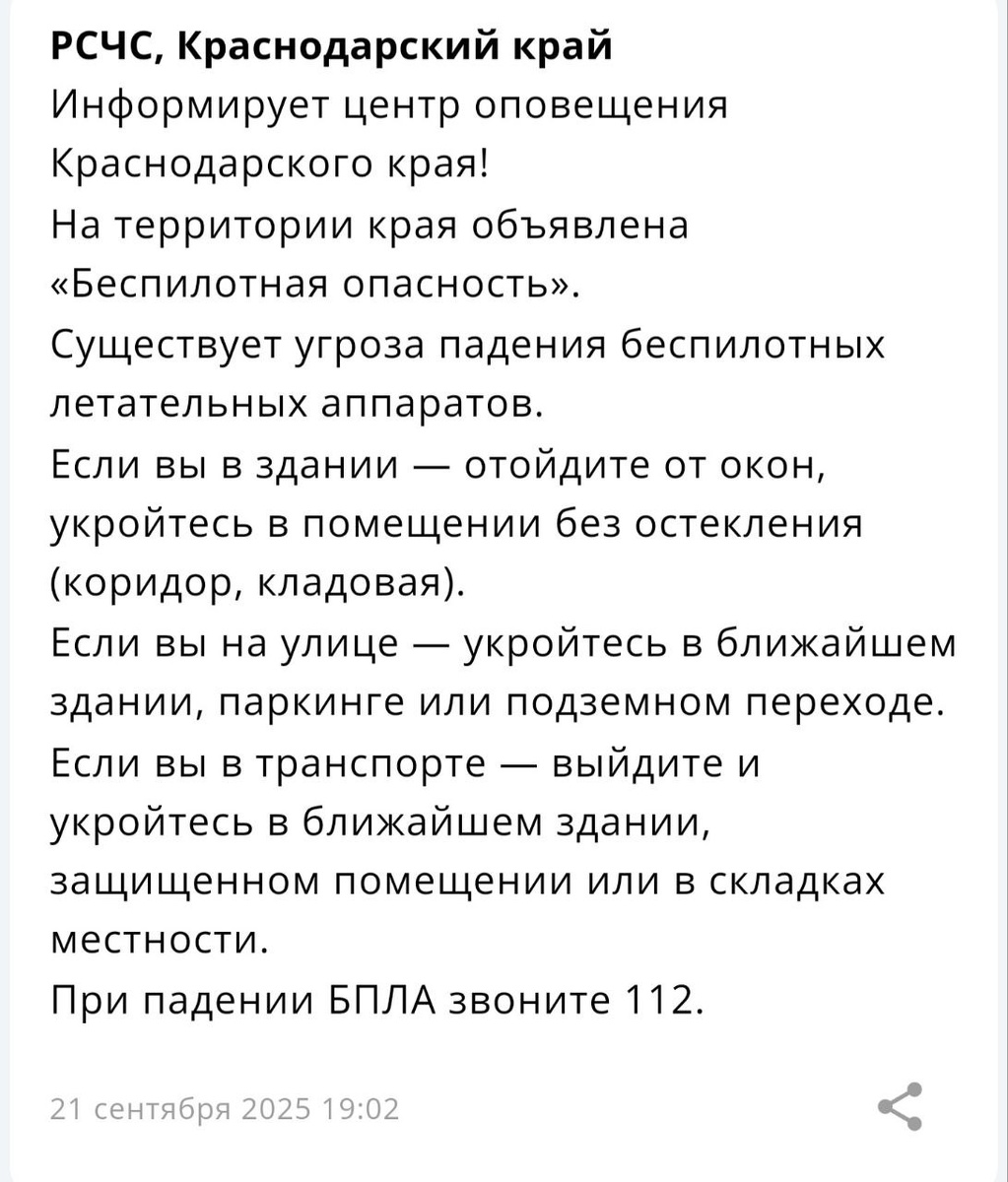 На территории Краснодара и края объявлена «Беспилотная опасность».
