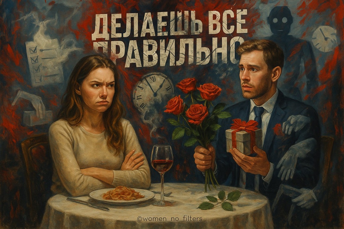 Ты встаёшь в 6 утра, чтобы купить её любимые круассаны. Она злится: "Зачем ты меня разбудил?!" 😤 Не покупаешь — злится: "Ты даже не помнишь, что я люблю!" Даришь цветы каждую неделю — "Это уже рутина, никакой романтики!" 🙄 Не даришь — "Другим дарят, а я что, не достойна?!" Соглашаешься с её мнением — "Тряпка! Нет своей позиции!" Споришь — "Вечно ты упрямишься!" Добро пожаловать в женскую логику, где правильный ответ — всегда неправильный 🎭 Я женщина. И я объясню тебе то, что мы никогда не скажем вслух: почему ваша "правильность" нас убивает. Проблема №1: Ты стал предсказуемым 📅 Знаешь, что убивает отношения быстрее измены? Скука. Когда я знаю, что ты: Ты превратился в функцию. В приложение. В будильник, который звонит каждый день одинаково. А знаешь, что мы делаем с будильниками? Правильно. Выключаем и забываем 📴. Проблема №2: Твоя правильность — это ложь 🎭 Когда ты делаешь всё "правильно", ты не настоящий. Ты играешь роль. Роль идеального парня из женских фантазий. Которого не с