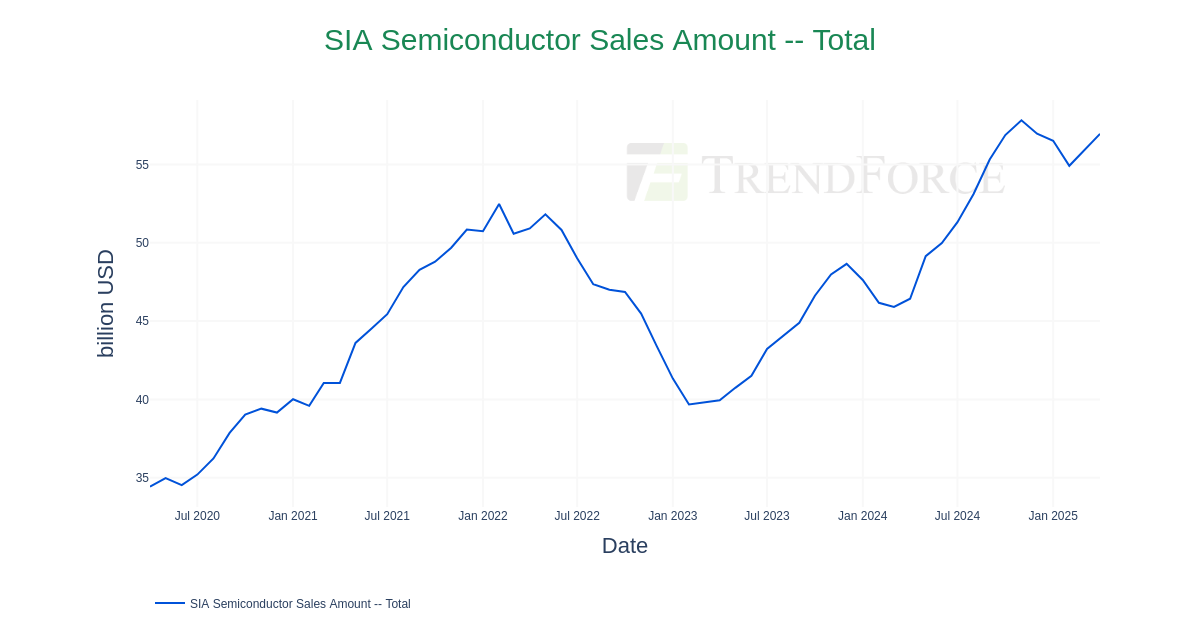 По данным Американской ассоциации полупроводниковой промышленности (SIA), в апреле 2025 года мировой рынок полупроводников продемонстрировал уверенную положительную динамику. Совокупный объем продаж достиг 57,0 млрд долларов, что на 2,5 % больше по сравнению с мартом текущего года и на 22,7 % выше уровня апреля 2024 года.
