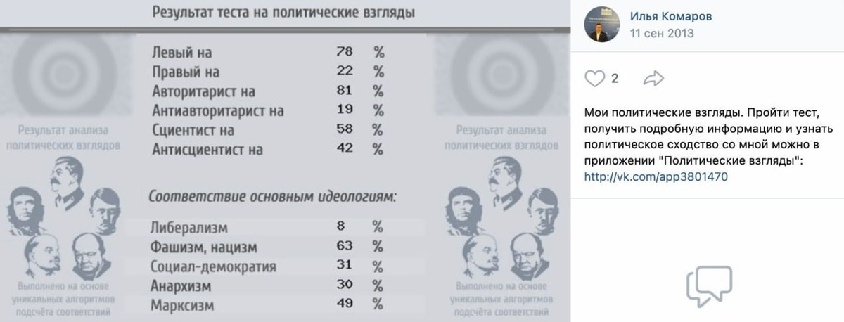 Депутата ЛДПР наказали за публикацию теста с фашистскими взглядами. Депутата ЛДПР Ивана Комарова оштрафовали за размещение в ВКонтакте результата теста на политические координаты, где в 2013 году он показал 63% фашистских взглядов и 81% поддержку «жёсткой руки». ────────── ⚡️Важные новости – без лишнего шума!⚡️ Подпишись на канал и получай только суть: оперативно, чётко, по делу! 👉 ИнфоСплетник | @infospletnik