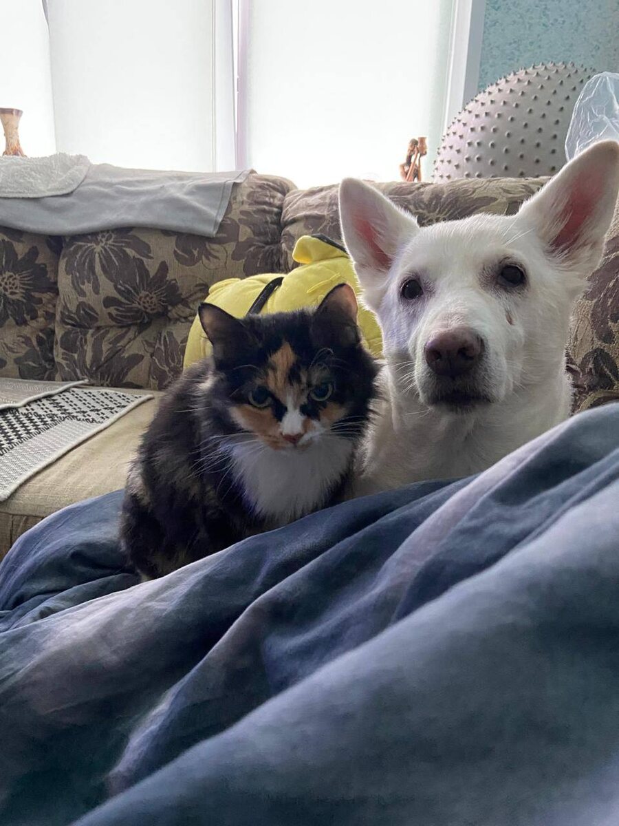 Как кошка с собакой 🤣 Наша Яра на передержке очень подружилась с кошкой. Они теперь не разлей вода. Где Яра - там и кошка. Две красотки ♥️ Ой, даже представить боимся, как они друг без друга жить будут, если придется разлучать