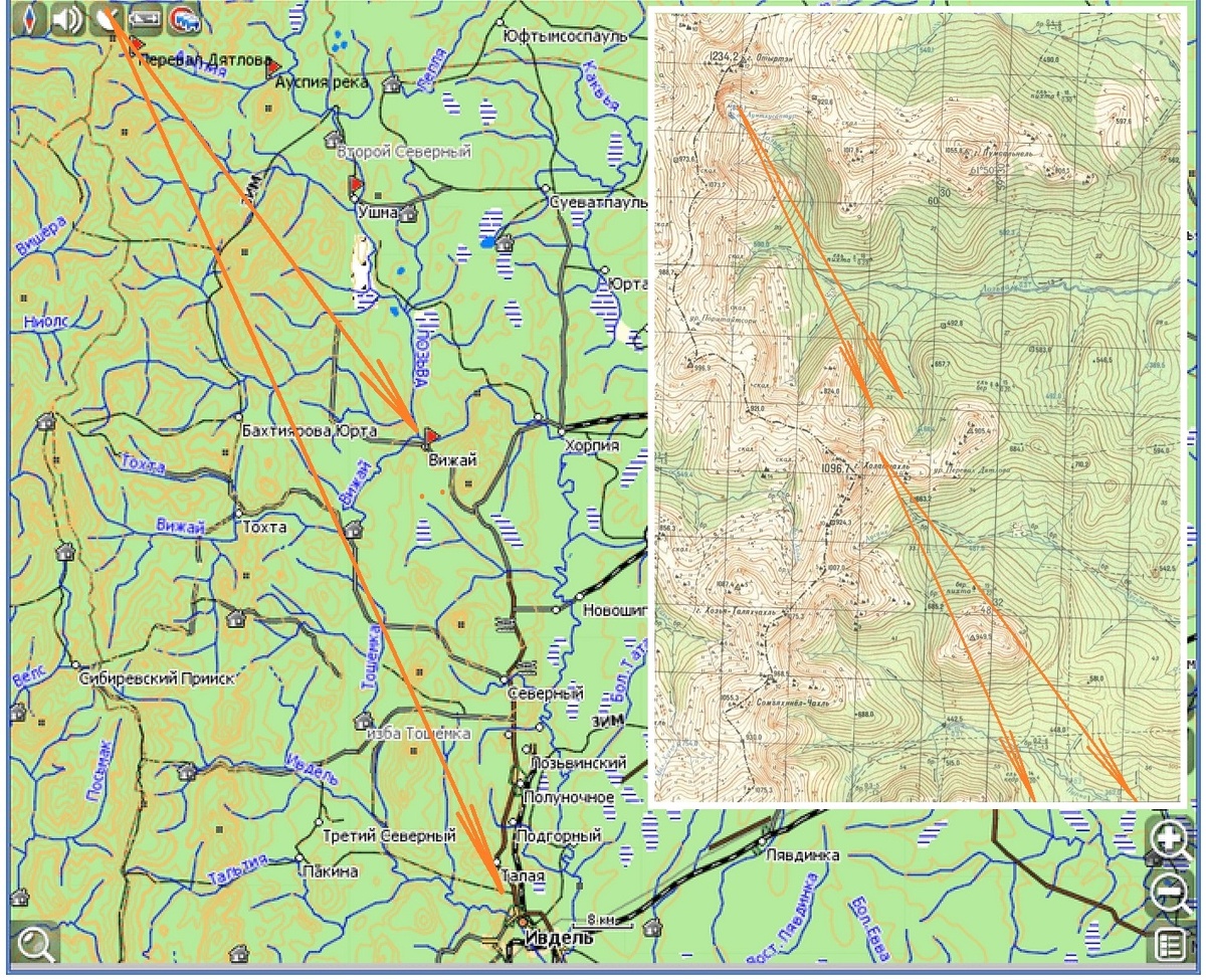Здесь, таким образом, я открываю ещё один секрет – отвечаю на спорный недоумённый вопрос: – Почему Дятлов поставил палатку на склоне. В таком «дурацком» месте. А если посмотреть точку установки палатки на северо-восточном отроге Холатчахля на карте, то понятно преимущество для радиосвязи с Ивделем, Вижаем. Аналогично удобно и место Карового озера у подножия горы Отортен. Можно было и от вертолётной площадки ближе к притоку Ауспии, но это полный возврат к местам предыдущего ночлега.