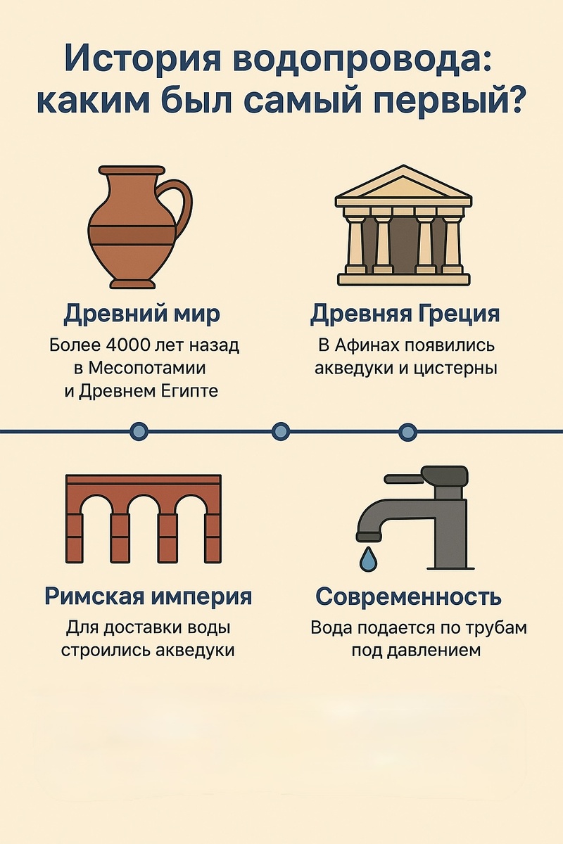 Сегодня открыть кран и получить воду - дело привычное. Но когда-то это было чудом инженерии. Давайте заглянем в прошлое и узнаем, каким был самый первый водопровод. Древний мир: начало истории Первые системы водоснабжения появились ещё более 4000 лет назад в Месопотамии и Древнем Египте. Там использовались глиняные трубы и каналы для подачи воды к дворцам и храмам. У египтян воду распределяли по арыкам, а богатые дома могли похвастаться простейшими трубами из меди. Древняя Греция: эстетика и польза Греки первыми стали уделять внимание не только доставке воды, но и её качеству. В Афинах были построены акведуки и цистерны, чтобы хранить воду, а в богатых домах появлялись «ванные комнаты» с примитивной канализацией. Римская империя: масштаб и мощь Именно римляне сделали водопровод символом цивилизации. Их знаменитые акведуки могли доставлять миллионы литров воды ежедневно. Вода поступала не только в дома знати, но и в бани, фонтаны и даже в канализацию. Римские свинцовые трубы — прямые п