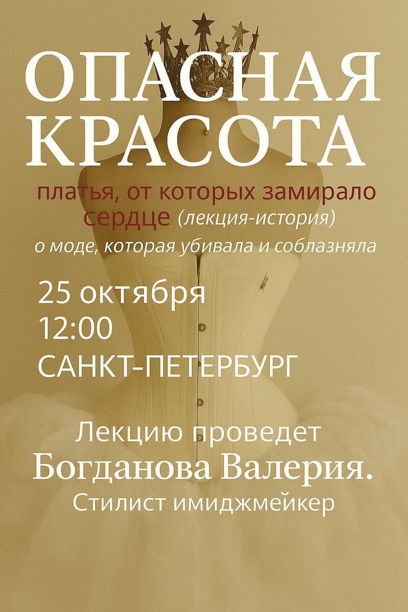 ❗️ПРЕМЬЕРА❗️ ОПАСНАЯ КРАСОТА: платья, от которых замирало сердце (буквально) Лекция-история о моде, которая убивала и соблазняла Дата: 25 октября | 12:00 (сб) Адрес: центр,место уточняется МЕСТ: 12 Лектор — Валерия Богданова Практикующий стилист имиджмейкер с 10-летним опытом, автор курсов. Создала более 1000 гардеробов для женщин, раскрыва их стиль как способ самовыражения и источник уверенности. Корсеты, в которых задыхались. Кринолины, из-за которых женщины сгорали заживо. Ядовитые ткани, от которых умирали. И… веера, которые говорили больше, чем слова. Ты узнаешь: • Какие платья XIX века действительно калечили женщин (и почему они всё равно их носили) • Как мышьяк, металл и огонь стали частью женского гардероба • Как с помощью веера можно было сказать «ты мне нравишься»… или «вы мне противны» • Почему одежда была не только про моду, но и про власть, страсть и игру Живое, визуальное и очень неожиданное погружение в историю моды. Приходи — будет красиво, страшно и захватываю