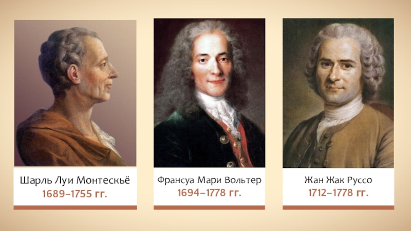 Выдающимся просветителем старшего поколения был Шарль Луи Монтескье (1689-1755). Известность ему принесли "Персидские письма" (1721) – сатирическое изображение нравов французского двора, написанное от лица персов, прибывших во Францию в конце царствования Людовика XIV. Широкий общественный резонанс получила конституционная теория Монтескье, изложенная в трактате "О духе законов" (1748). Разнообразие исторических судеб древних и современных народов мыслитель связывал с условиями их жизни, в первую очередь с природой и климатом, а особенности государственного строя – с размерами территории страны. Наилучшим государственным устройством для Франции, с точки зрения Монтескье, была бы конституционная монархия, в которой власть короля ограничена законами и привилегиями аристократии. Образцом конституционной монархии для него была Англия. Развивая идеи Джона Локка, Монтескье создал теорию разделения властей. Независимость друг от друга законодательной, исполнительной и судебной власти являлась бы, по его мнению, гарантией свободы и предотвратила бы вырождение монархии в деспотию.