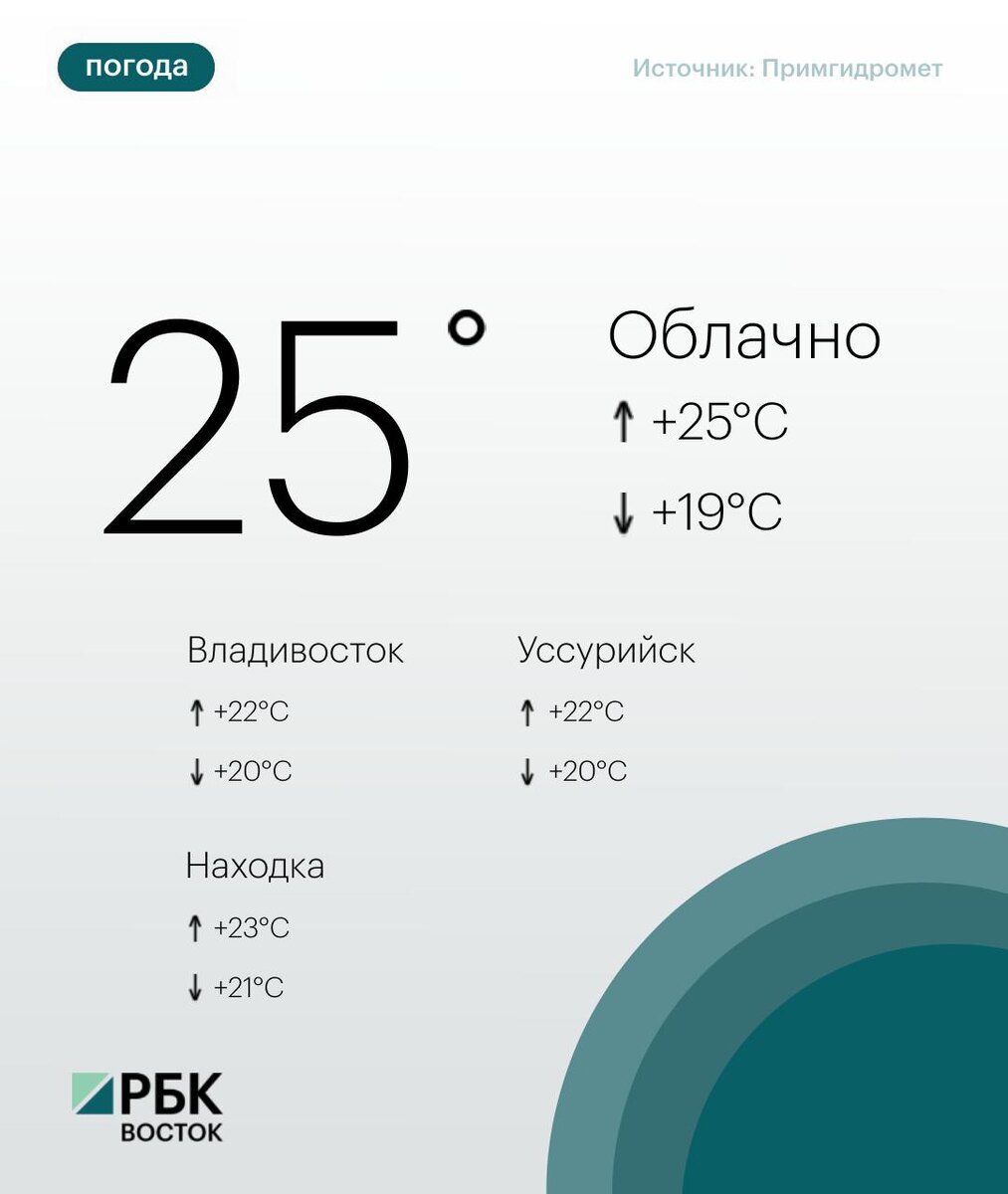 Сегодня погоду в Приморье определяет поле повышенного атмосферного давления. Без осадков. Ветер северный слабый, в конце дня южный умеренный. Температура воздуха +19...+25°С 🌧 Во Владивостоке небольшая облачность, без осадков. Ветер северный слабый до умеренного, вечером южный умеренный. Температура воздуха +20...+22°C. 😃Подписывайтесь на РБК Восток